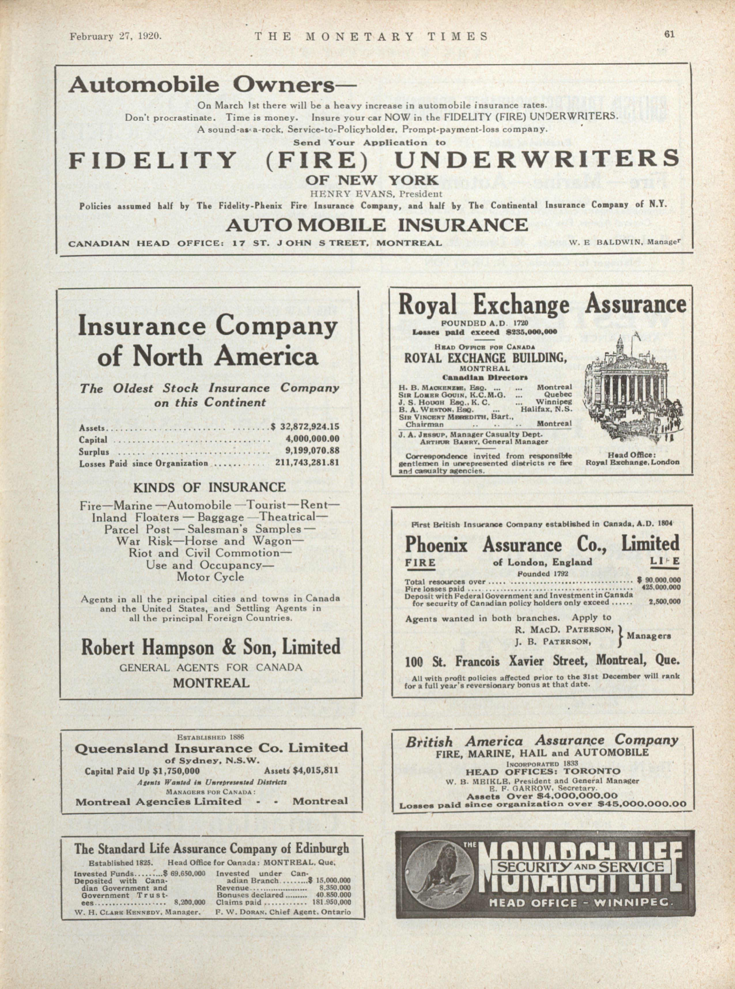 - The Monetary Times, trade review and insurance chronicle. : Volume 64 No. 9 (February 27, 1920)