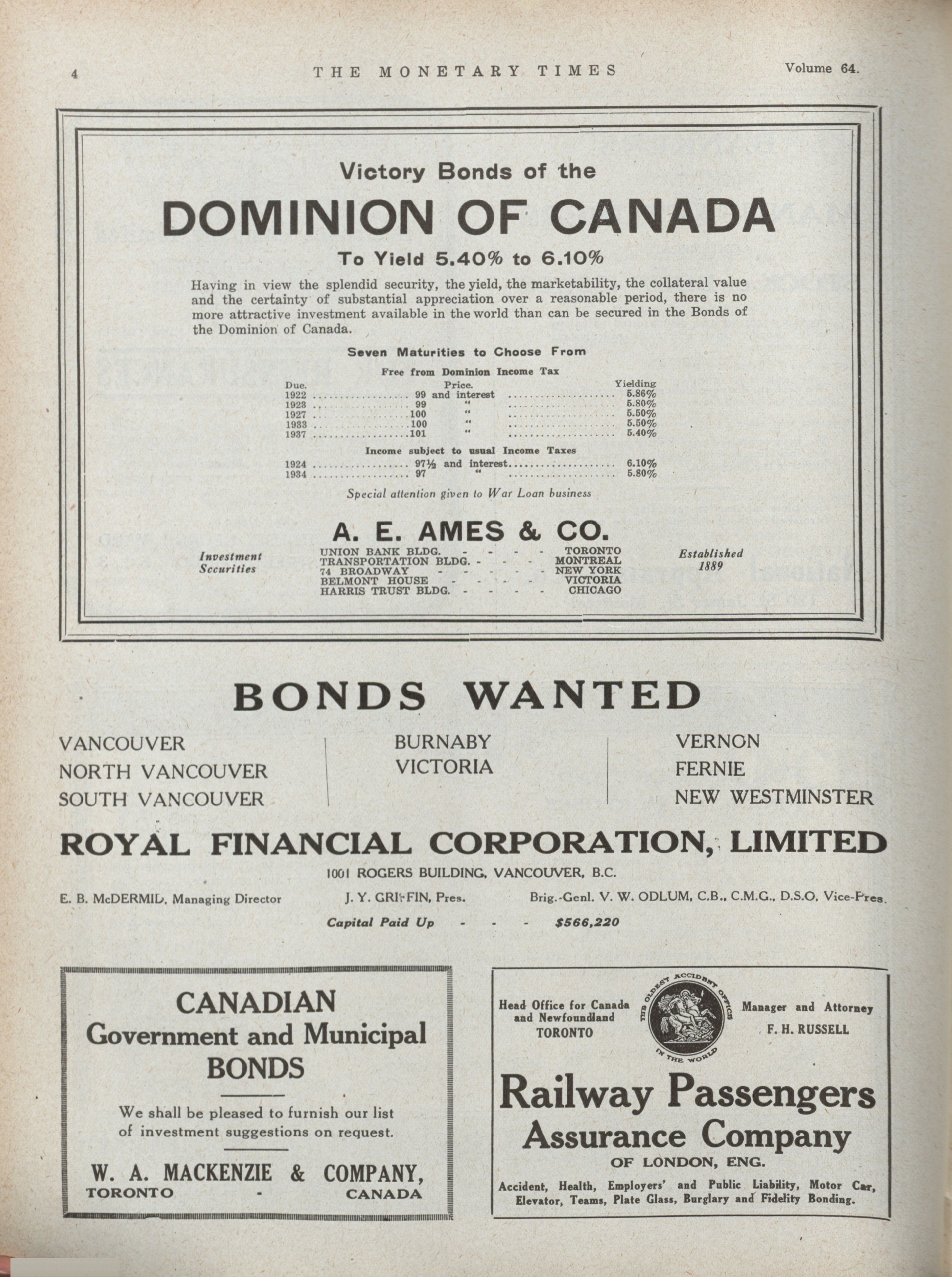 The Monetary Times, trade review and insurance chronicle. : Volume 64 No. 12 (March 19, 1920)