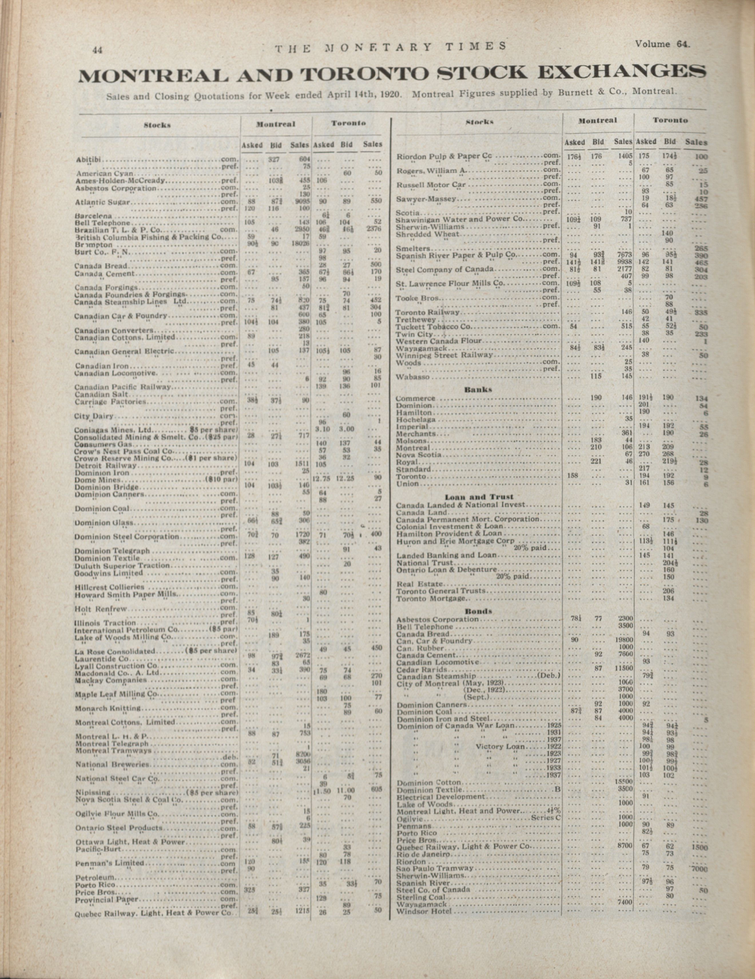 - The Monetary Times, trade review and insurance chronicle. : Volume 64 No. 16 (April 16, 1920)