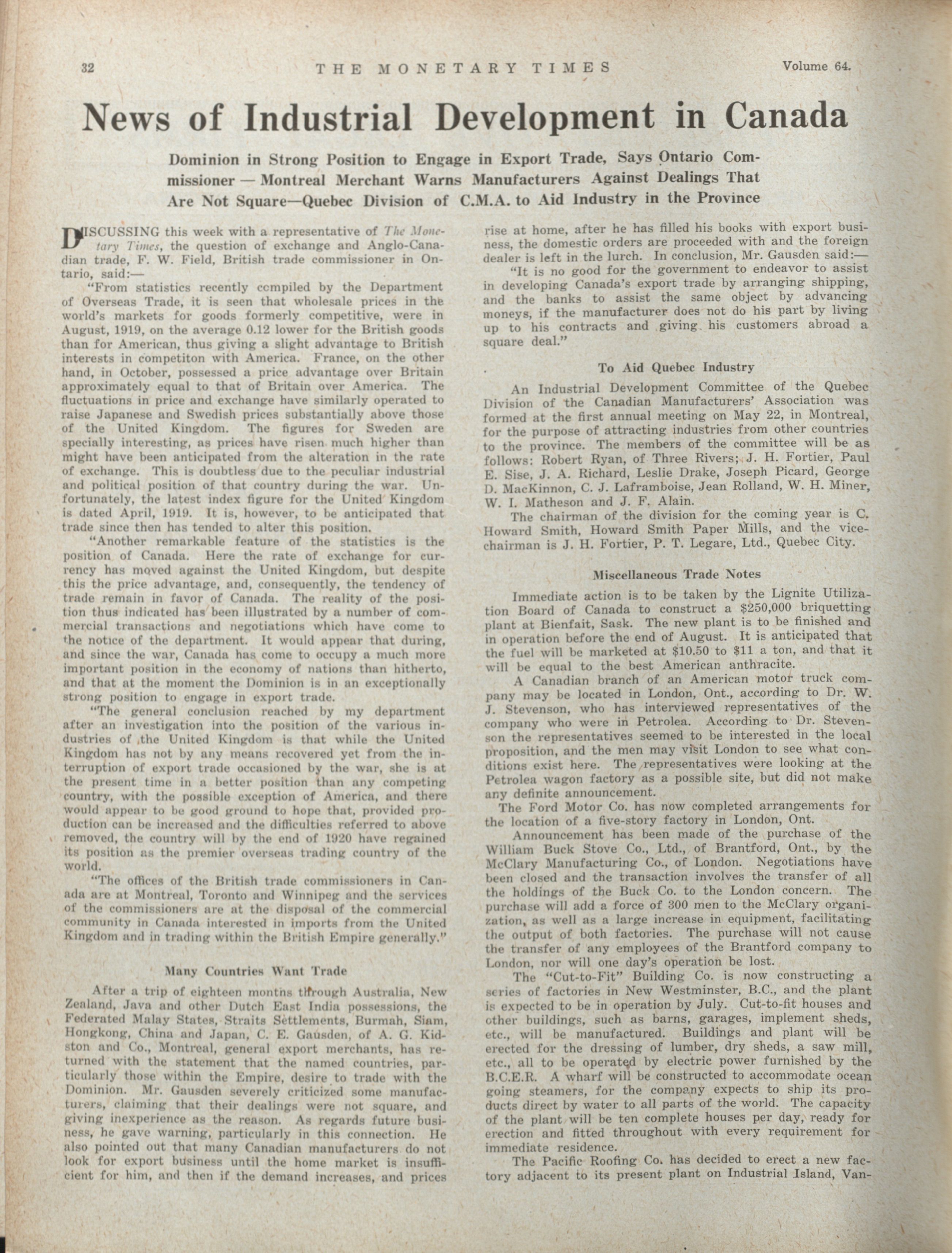- The Monetary Times, trade review and insurance chronicle. : Volume 64 No. 22 (May 28, 1920)