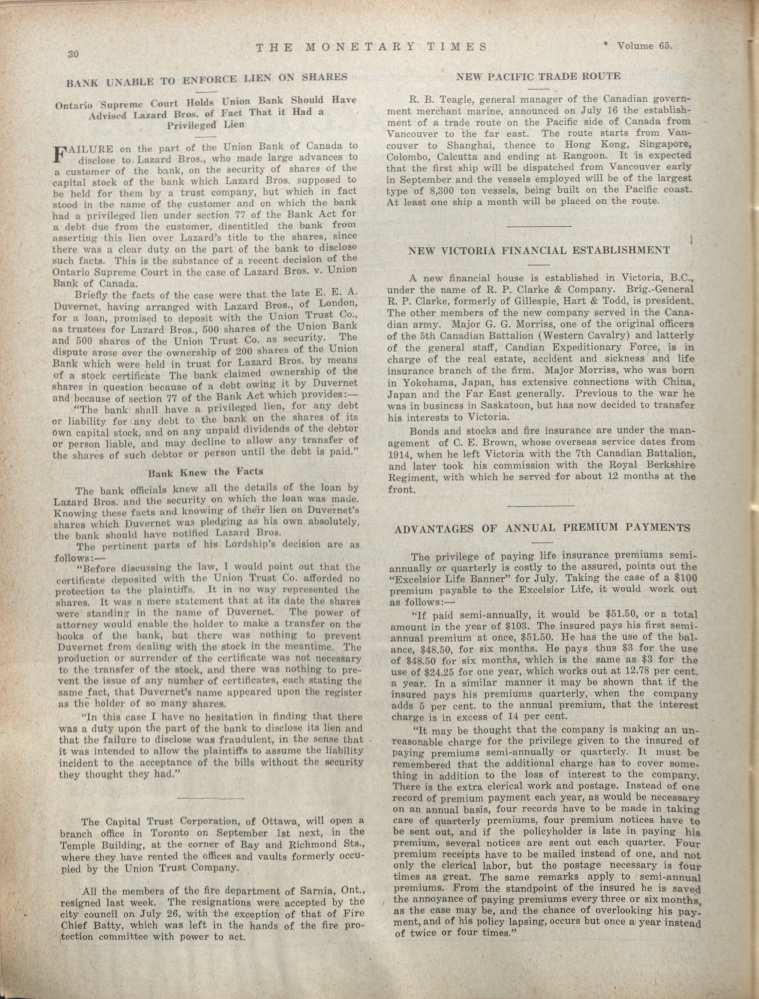 - The Monetary Times, trade review and insurance chronicle. : Volume 65 No. 6 (August 6, 1920)