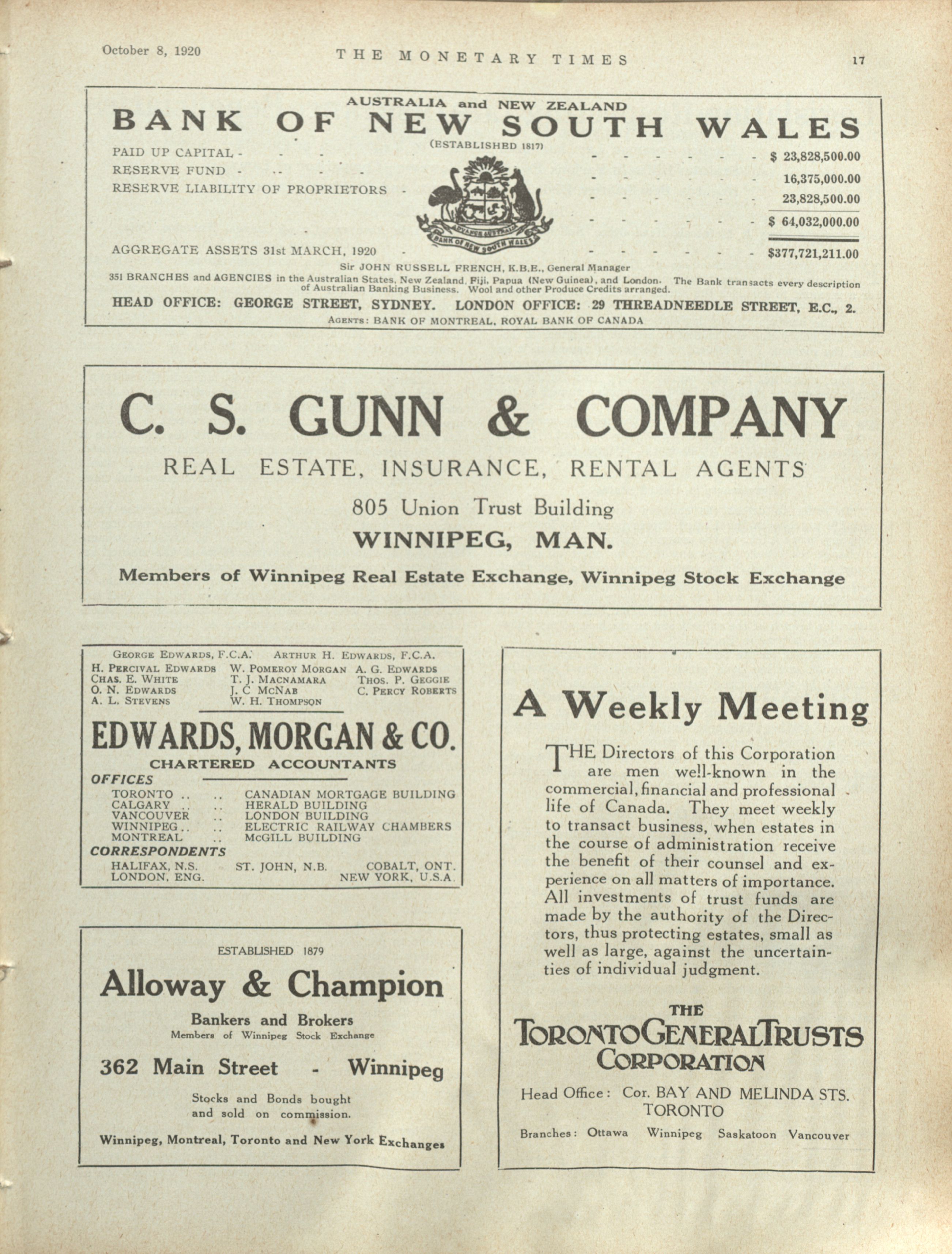 - The Monetary Times, trade review and insurance chronicle. : Volume 65 No. 15 (October 8, 1920)