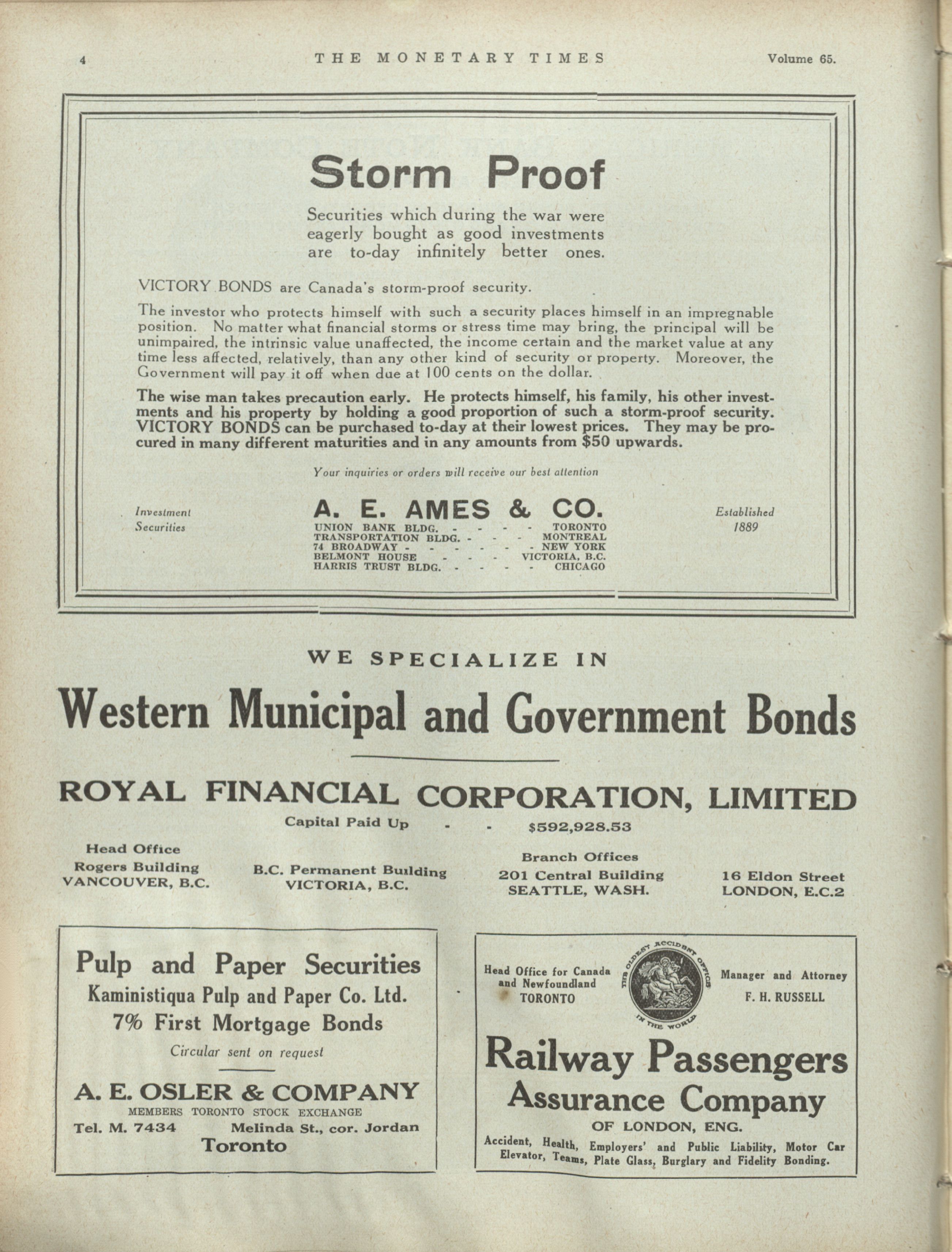 - The Monetary Times, trade review and insurance chronicle. : Volume 65 No. 15 (October 8, 1920)