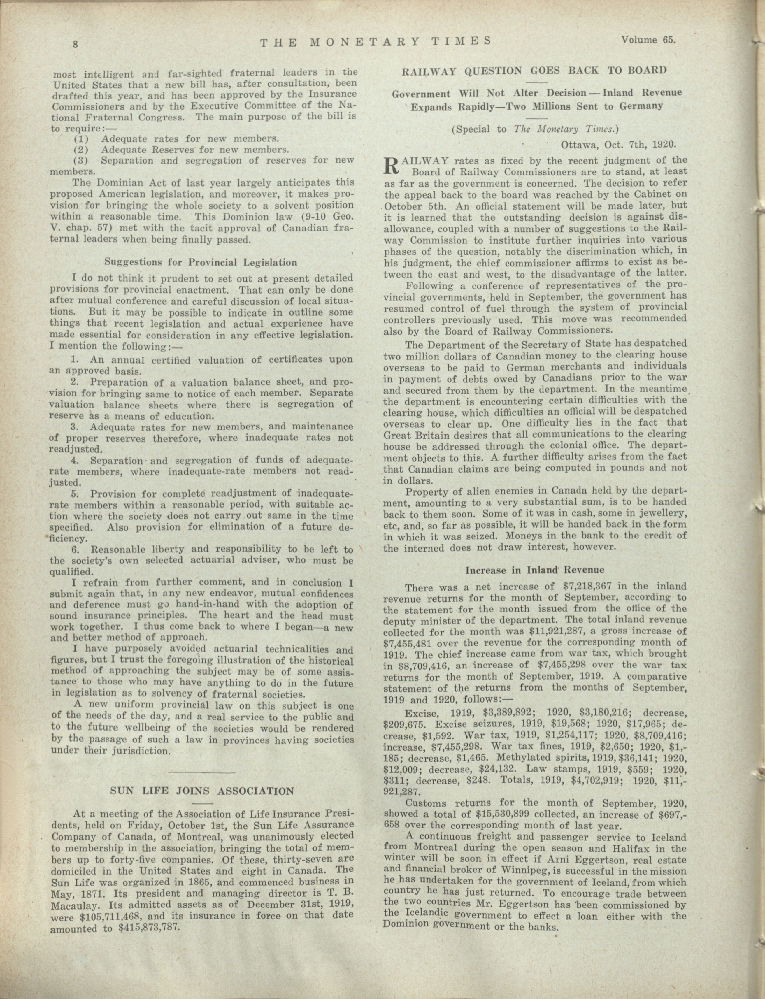 - The Monetary Times, trade review and insurance chronicle. : Volume 65 No. 15 (October 8, 1920)