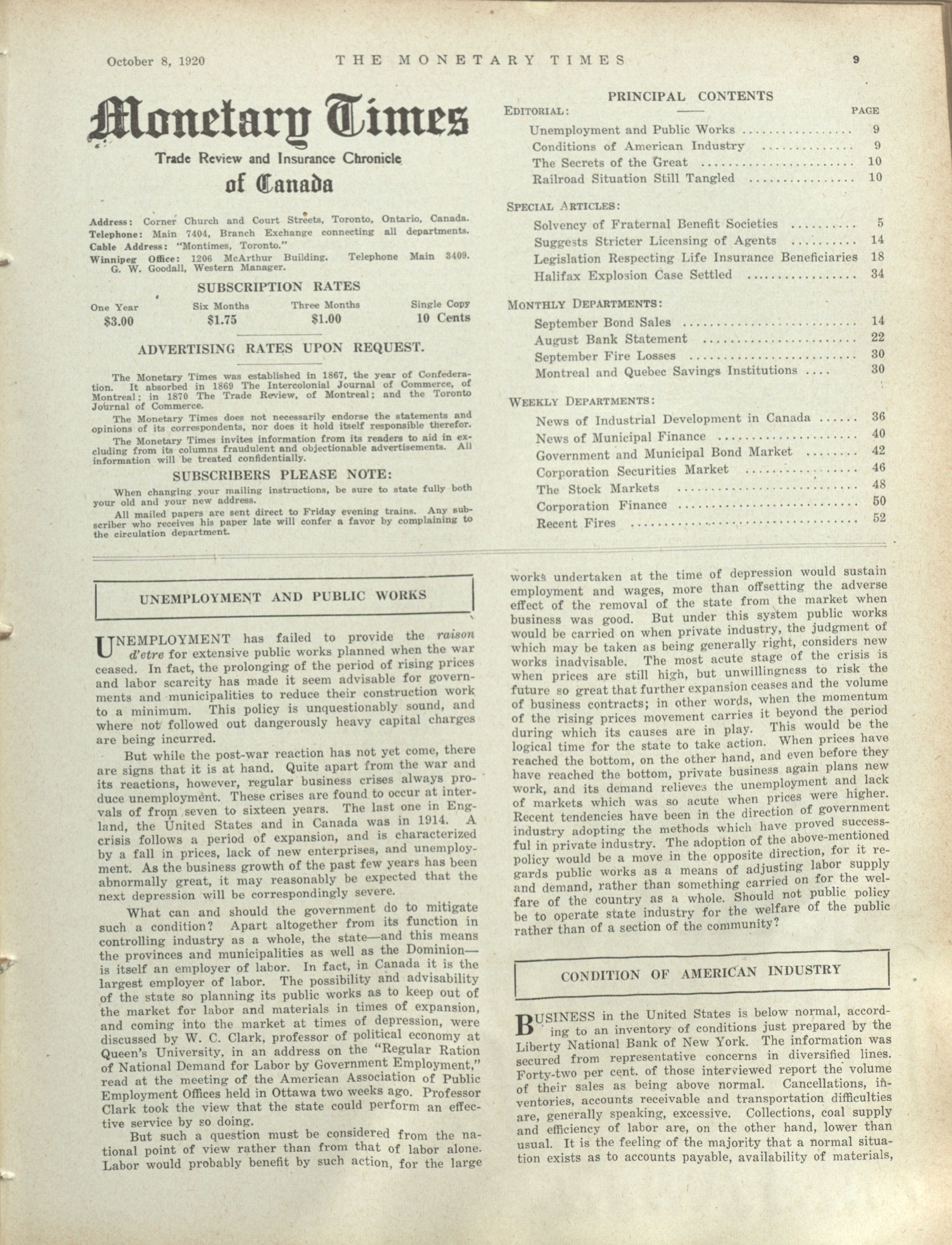 The Monetary Times, trade review and insurance chronicle. : Volume 65 No. 15 (October 8, 1920)