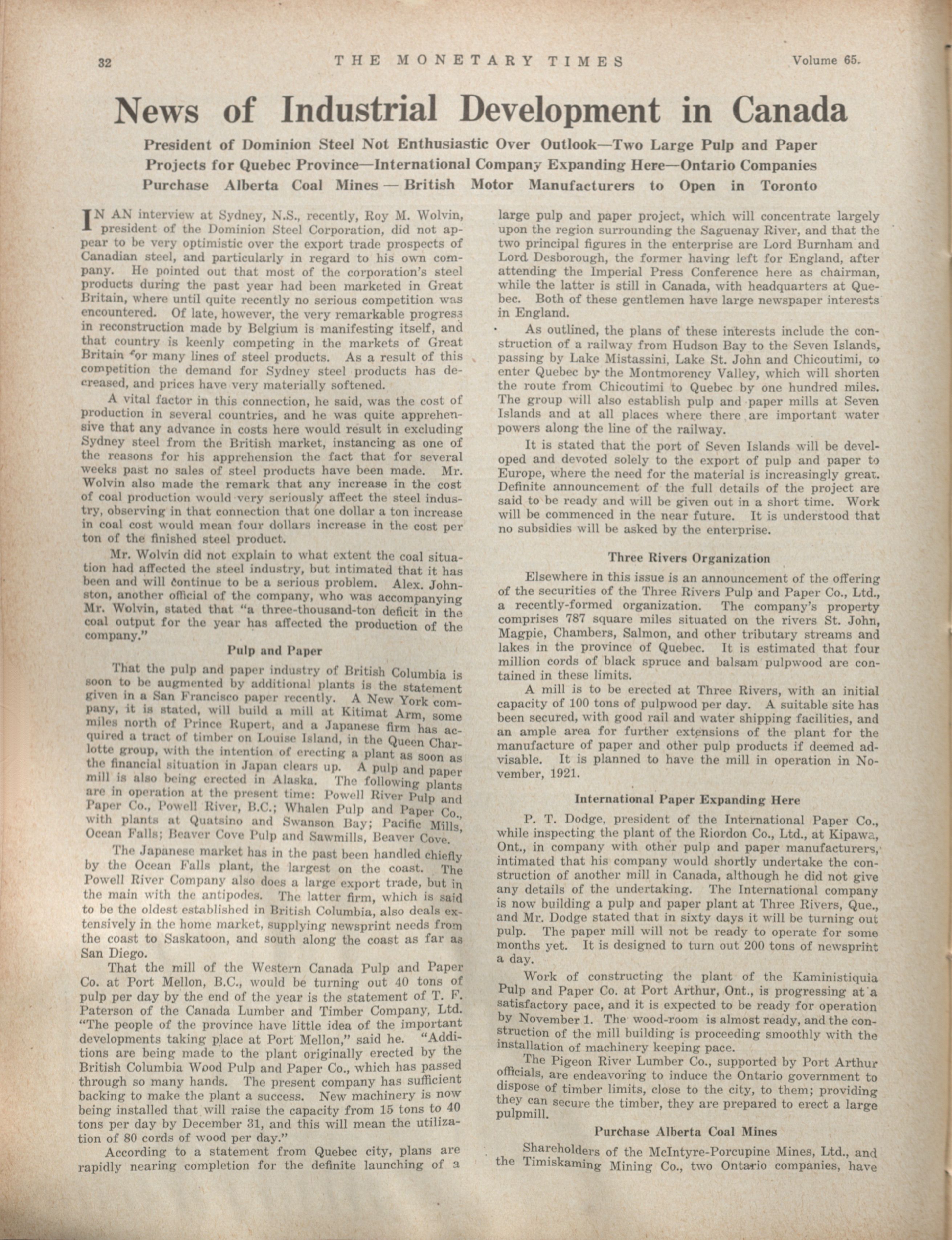 - The Monetary Times, trade review and insurance chronicle. : Volume 65 No. 16 (October 15, 1920)