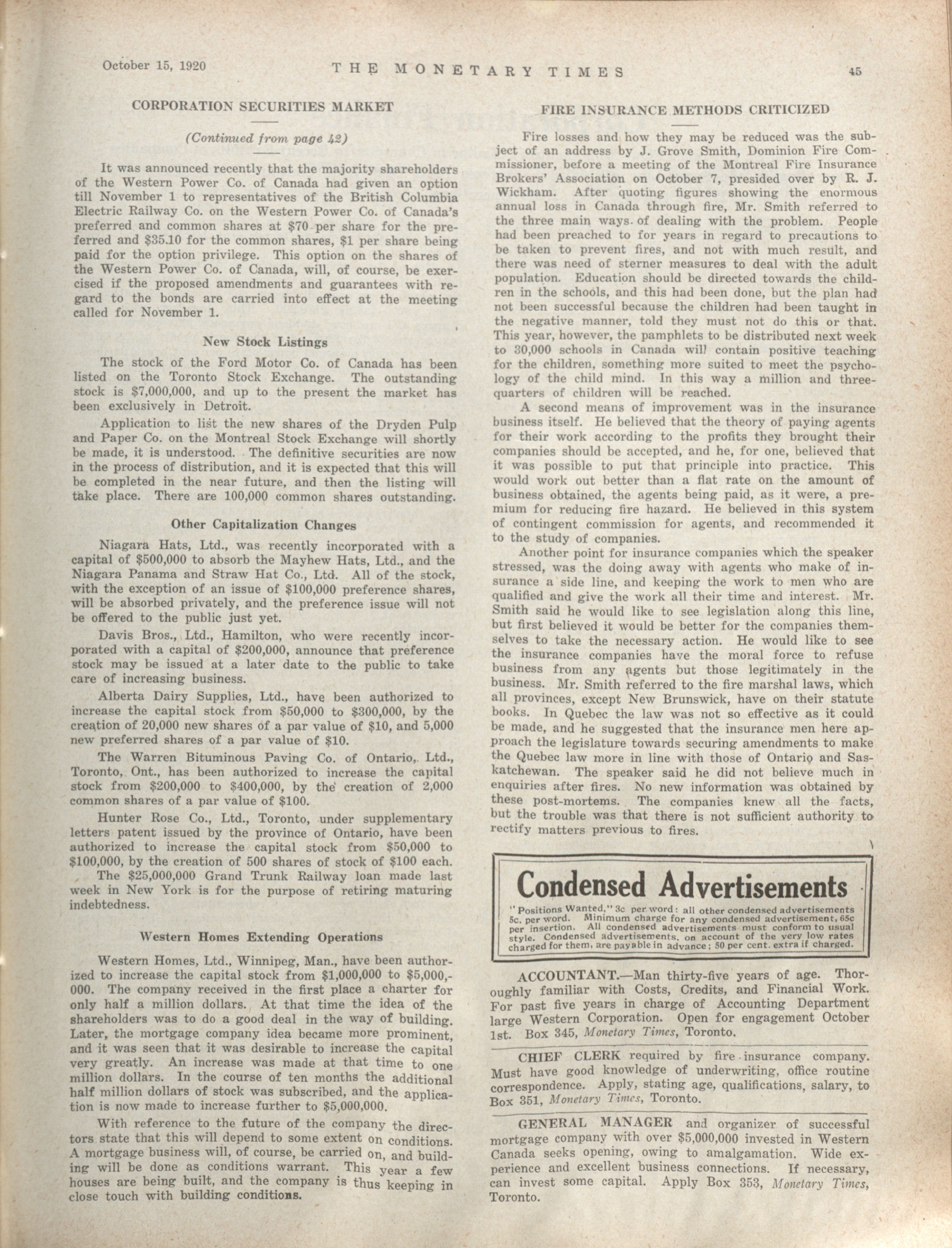 - The Monetary Times, trade review and insurance chronicle. : Volume 65 No. 16 (October 15, 1920)