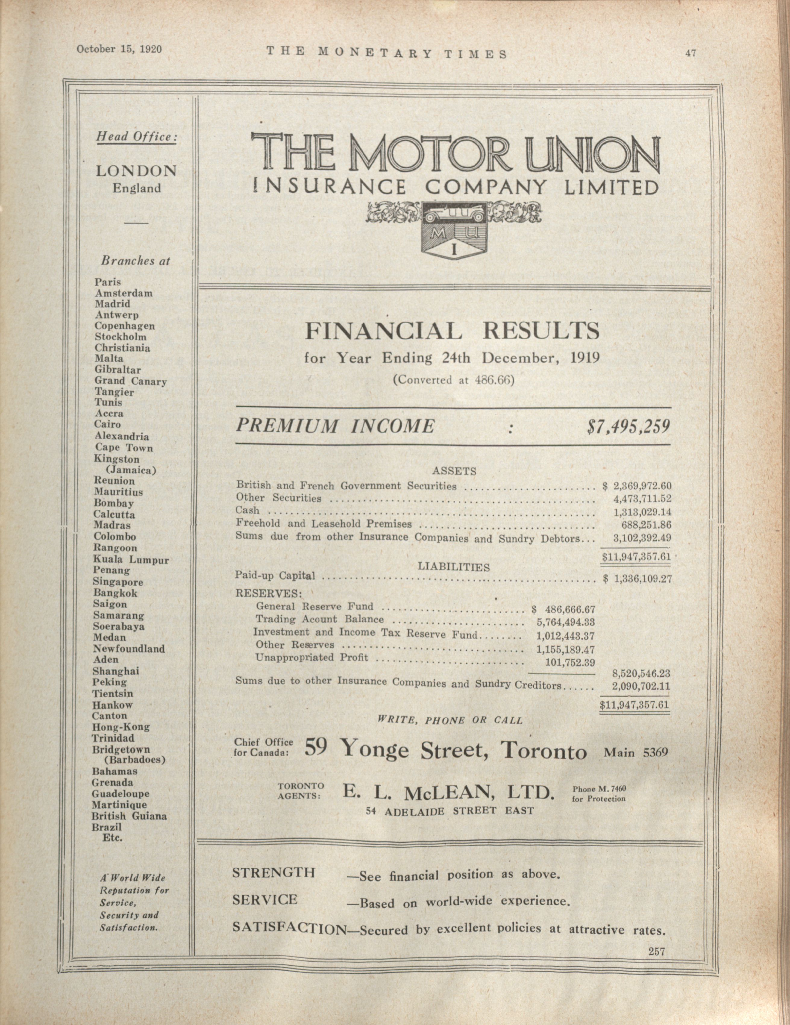 - The Monetary Times, trade review and insurance chronicle. : Volume 65 No. 16 (October 15, 1920)
