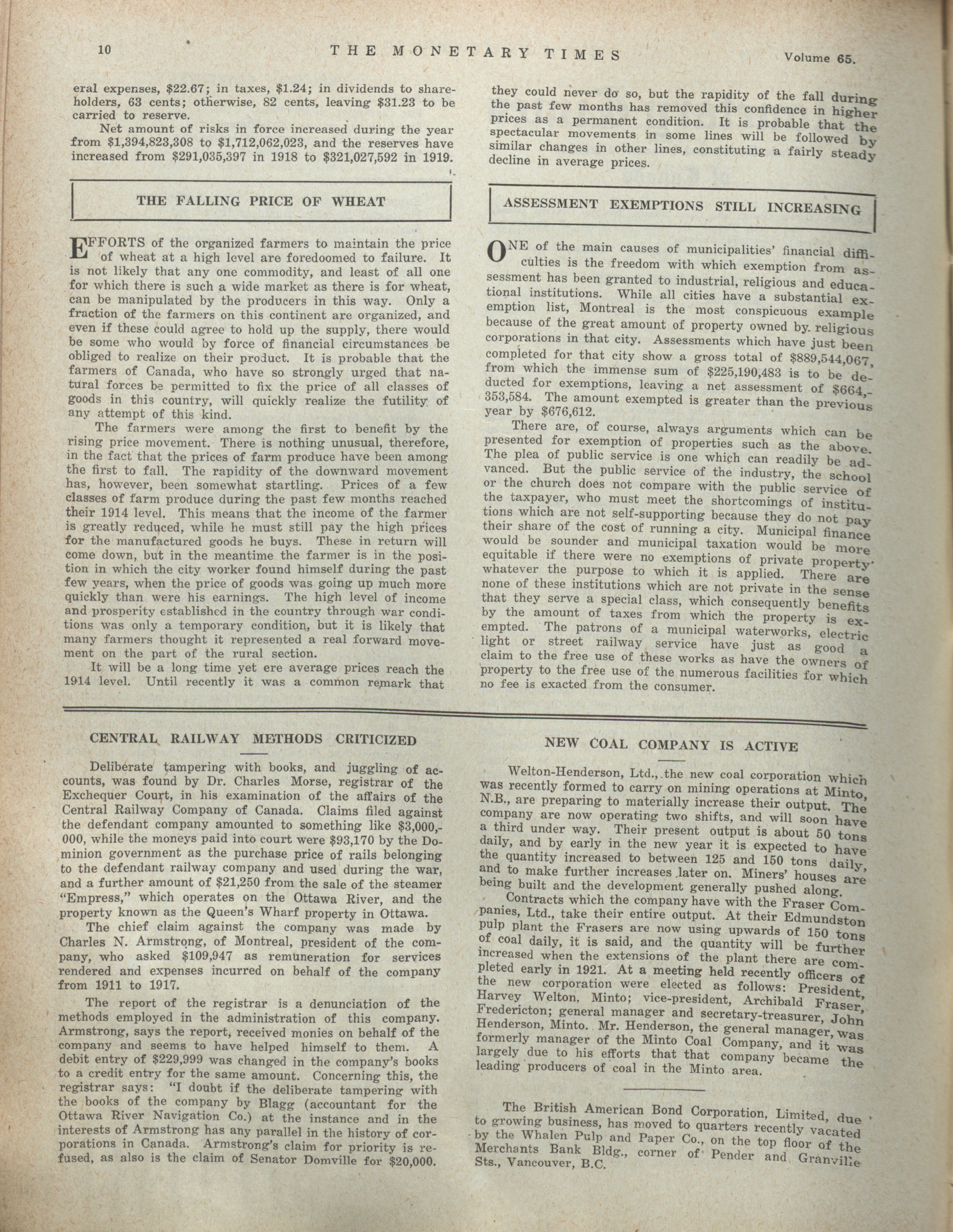 The Monetary Times, trade review and insurance chronicle. : Volume 65 No. 22 (November 26, 1920)