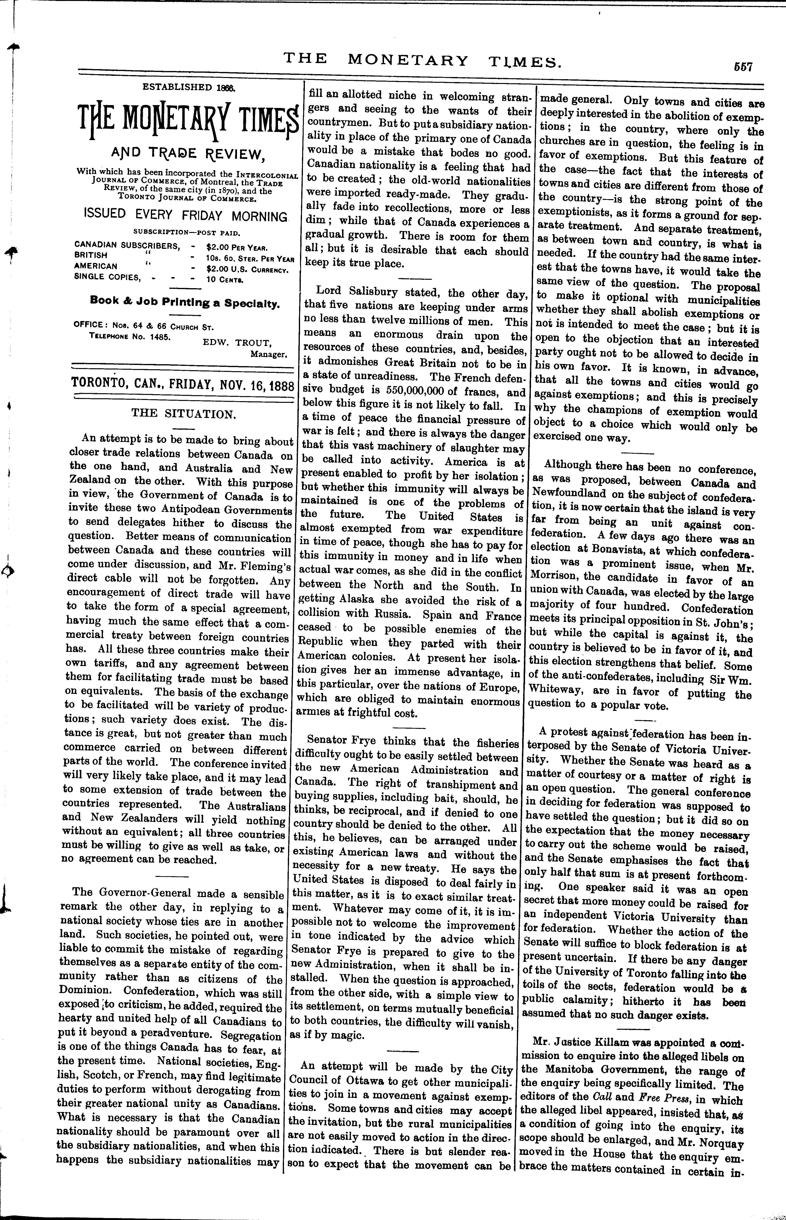 The monetary times, trade review and insurance chronicle : [Vol. 22, no. 20 (Nov. 16, 1888)]