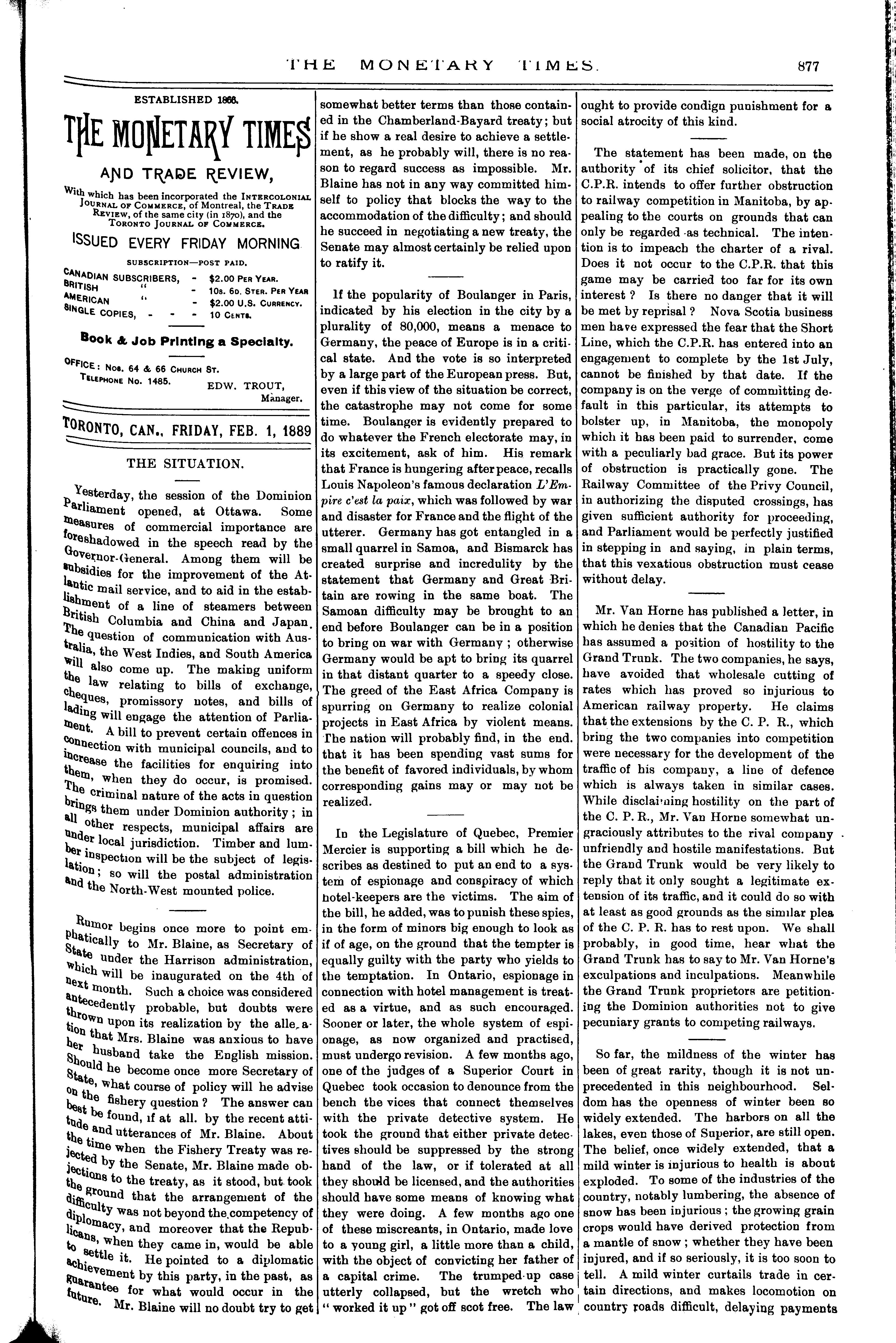 The monetary times, trade review and insurance chronicle [Vol. 22, no. 31 (Feb. 1, 1889)]