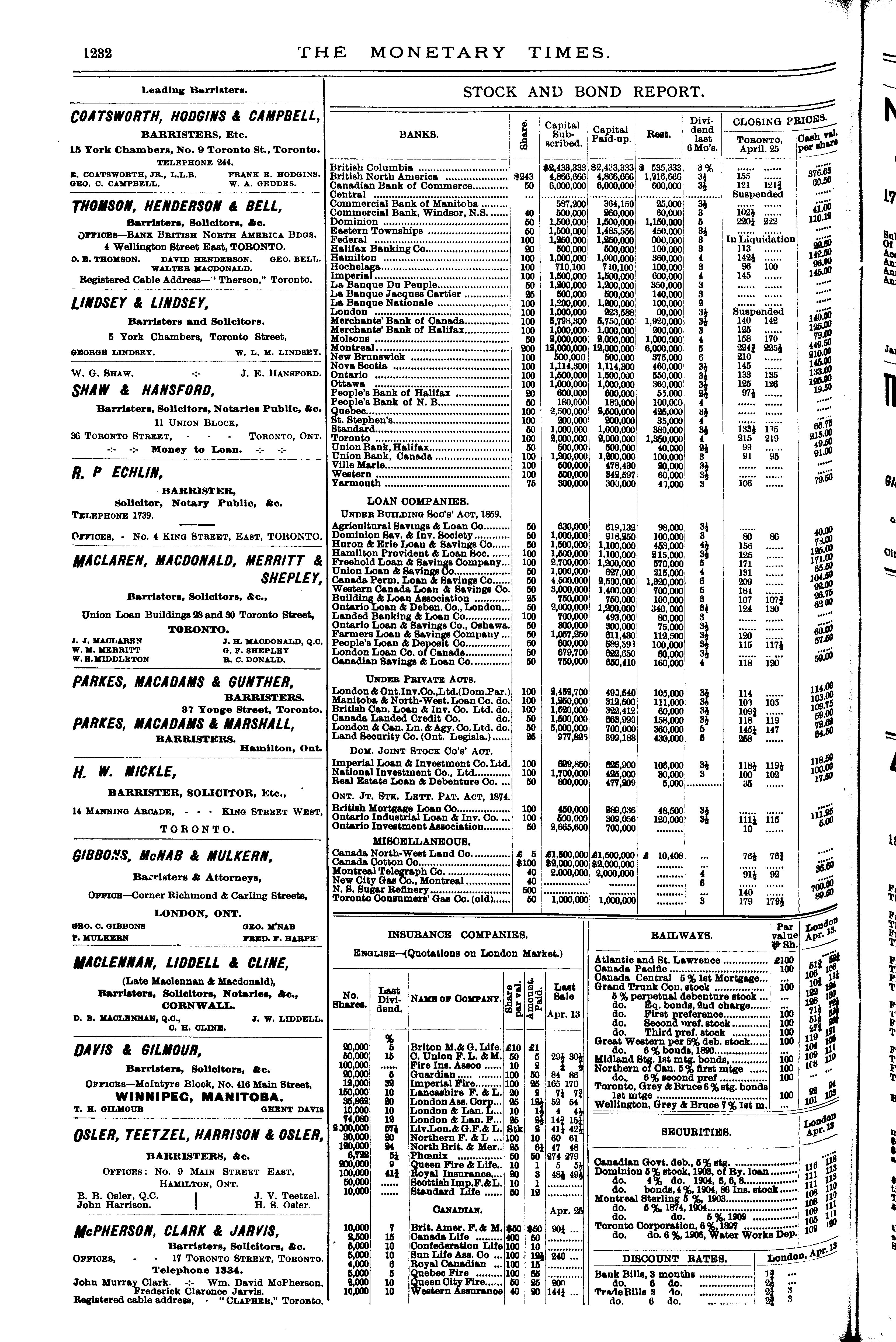 - The monetary times, trade review and insurance chronicle [Vol. 22, no. 43 (Apr. 26, 1889)]