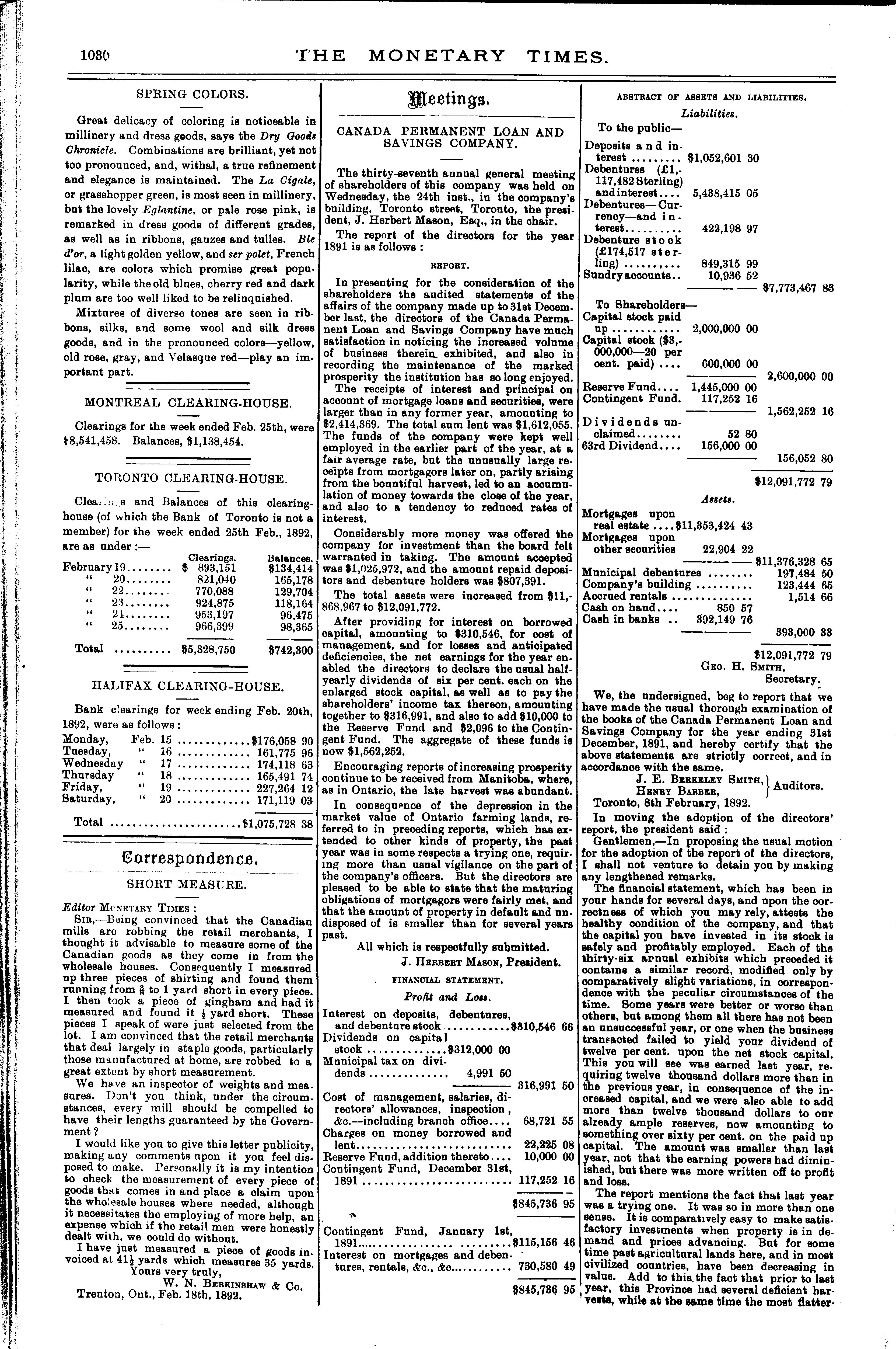 The monetary times, trade review and insurance chronicle : [Vol. 25, no. 35] (Feb. 26, 1892)]