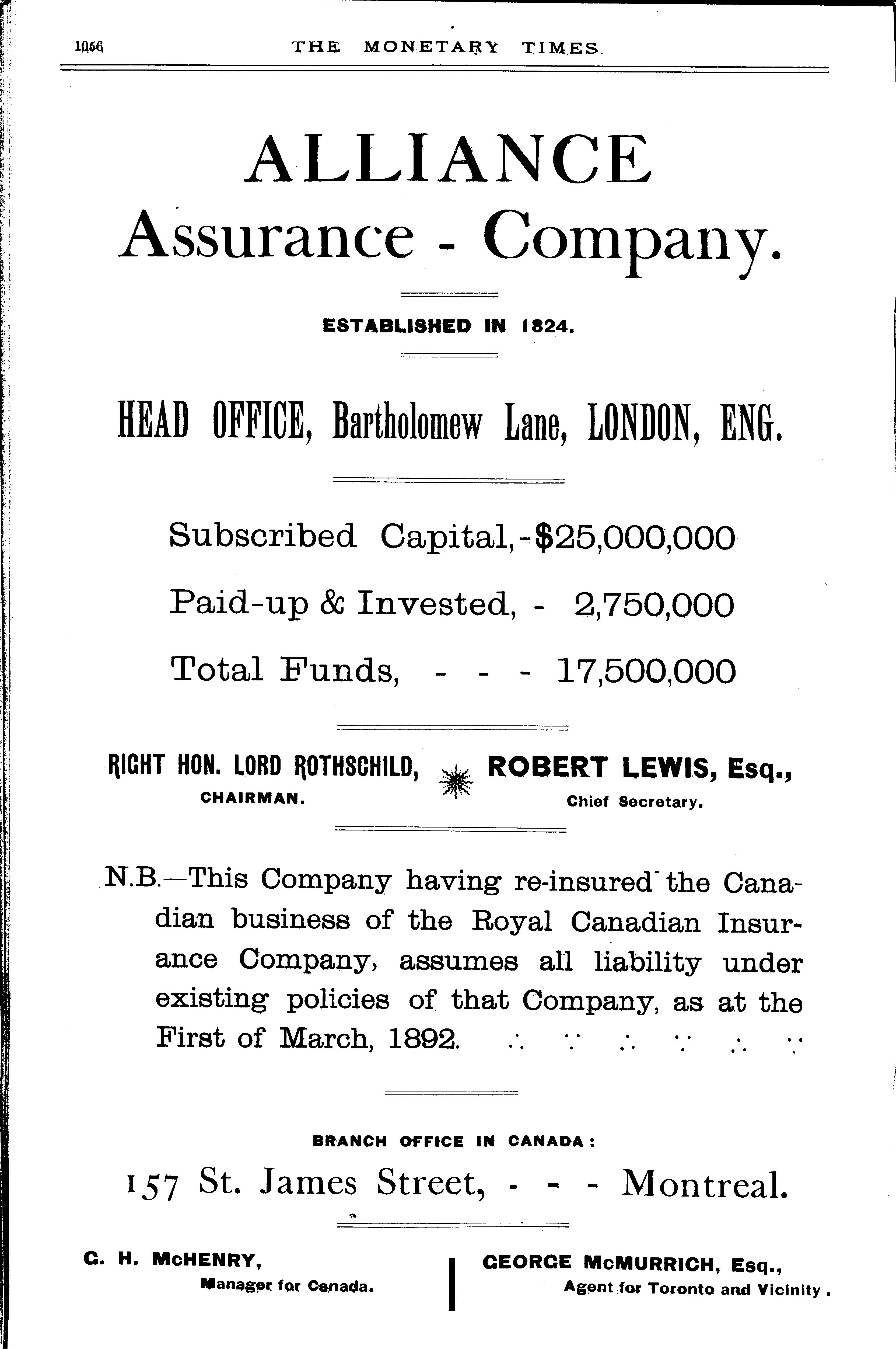 The monetary times, trade review and insurance chronicle : [Vol. 25, no. 36] (Mar. 4, 1892)]
