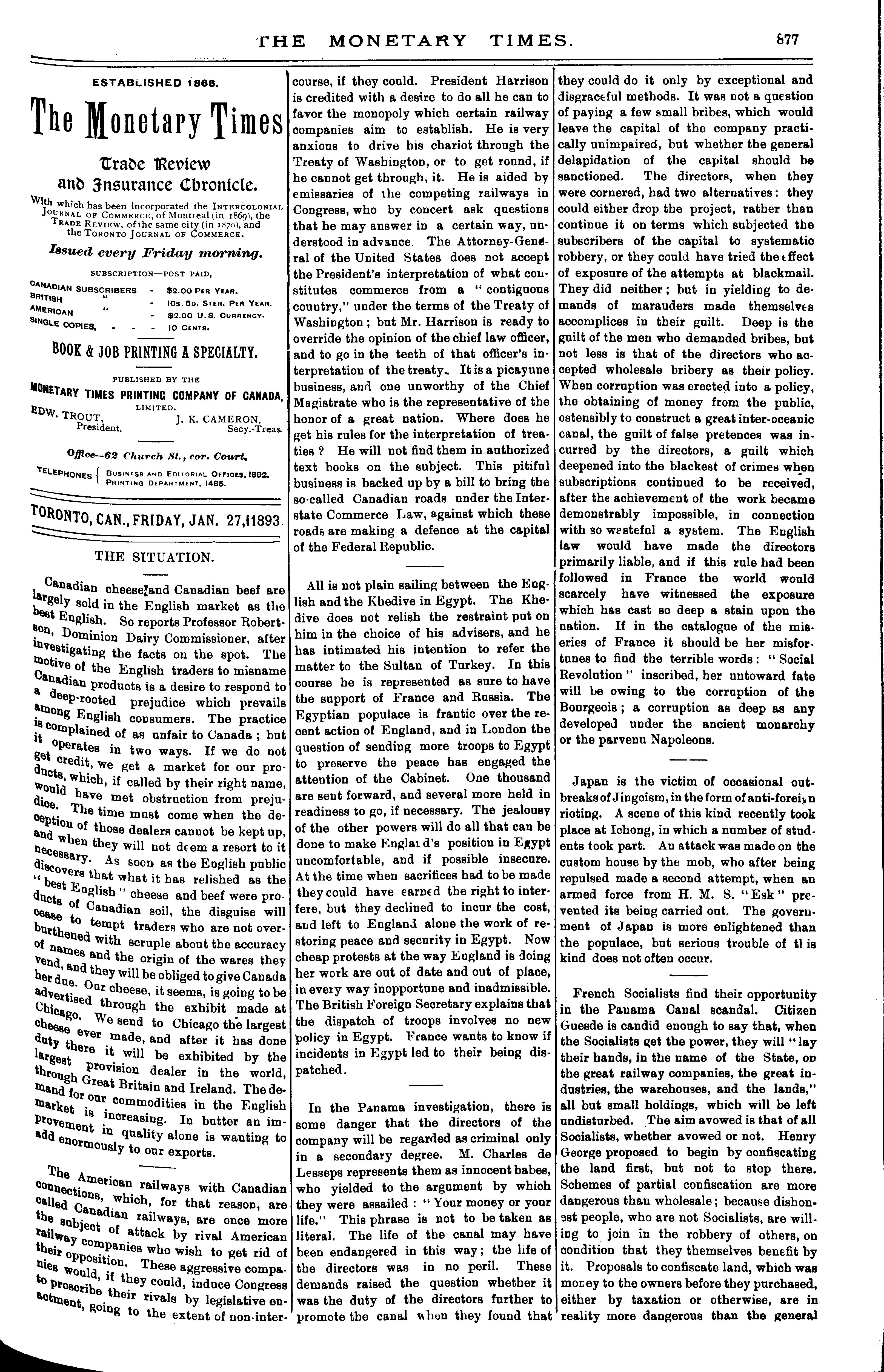 The monetary times, trade review and insurance chronicle : [Vol. 26, no. 30 (Jan. 27, 1893)]