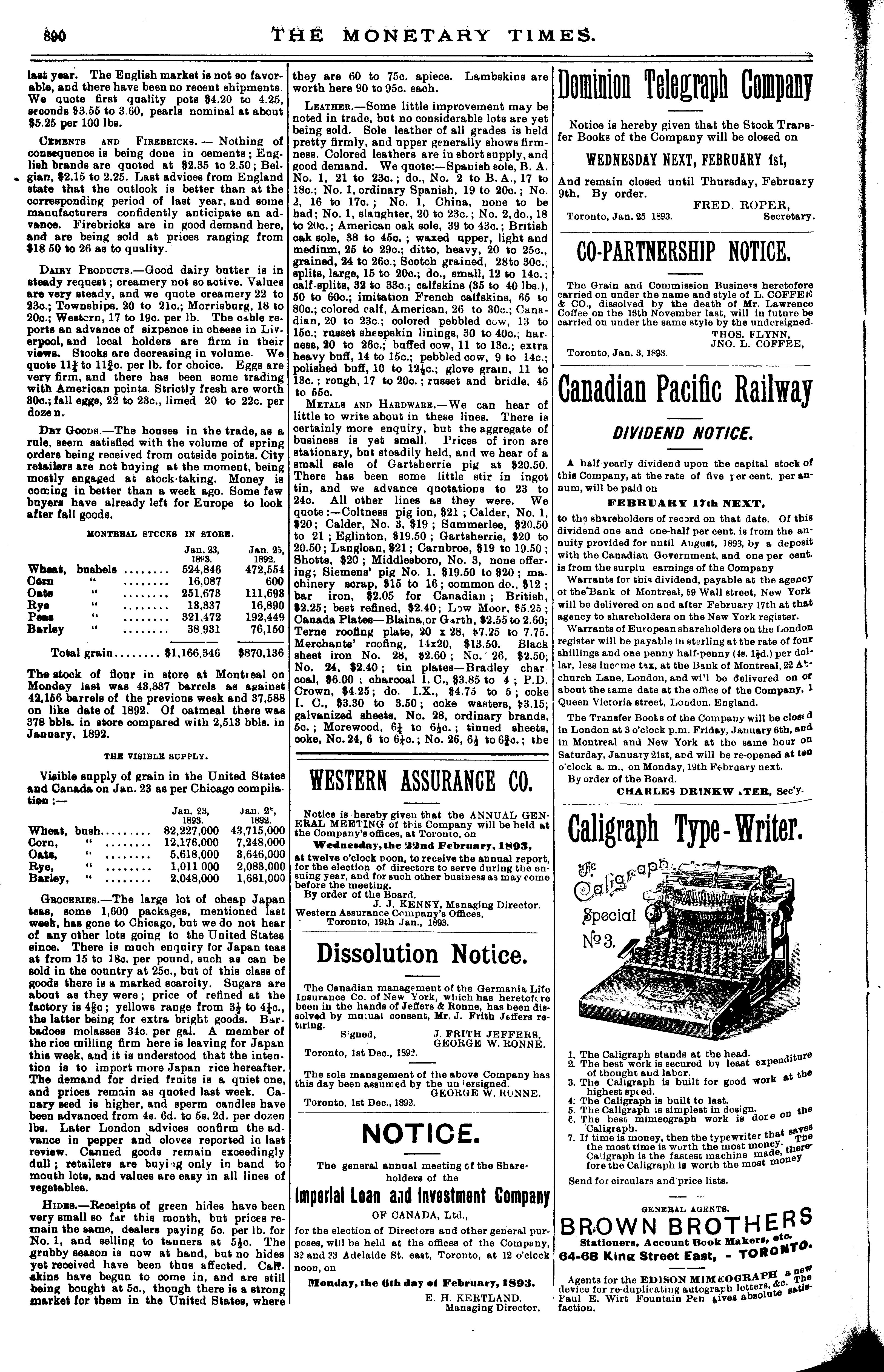 The monetary times, trade review and insurance chronicle : [Vol. 26, no. 30 (Jan. 27, 1893)]
