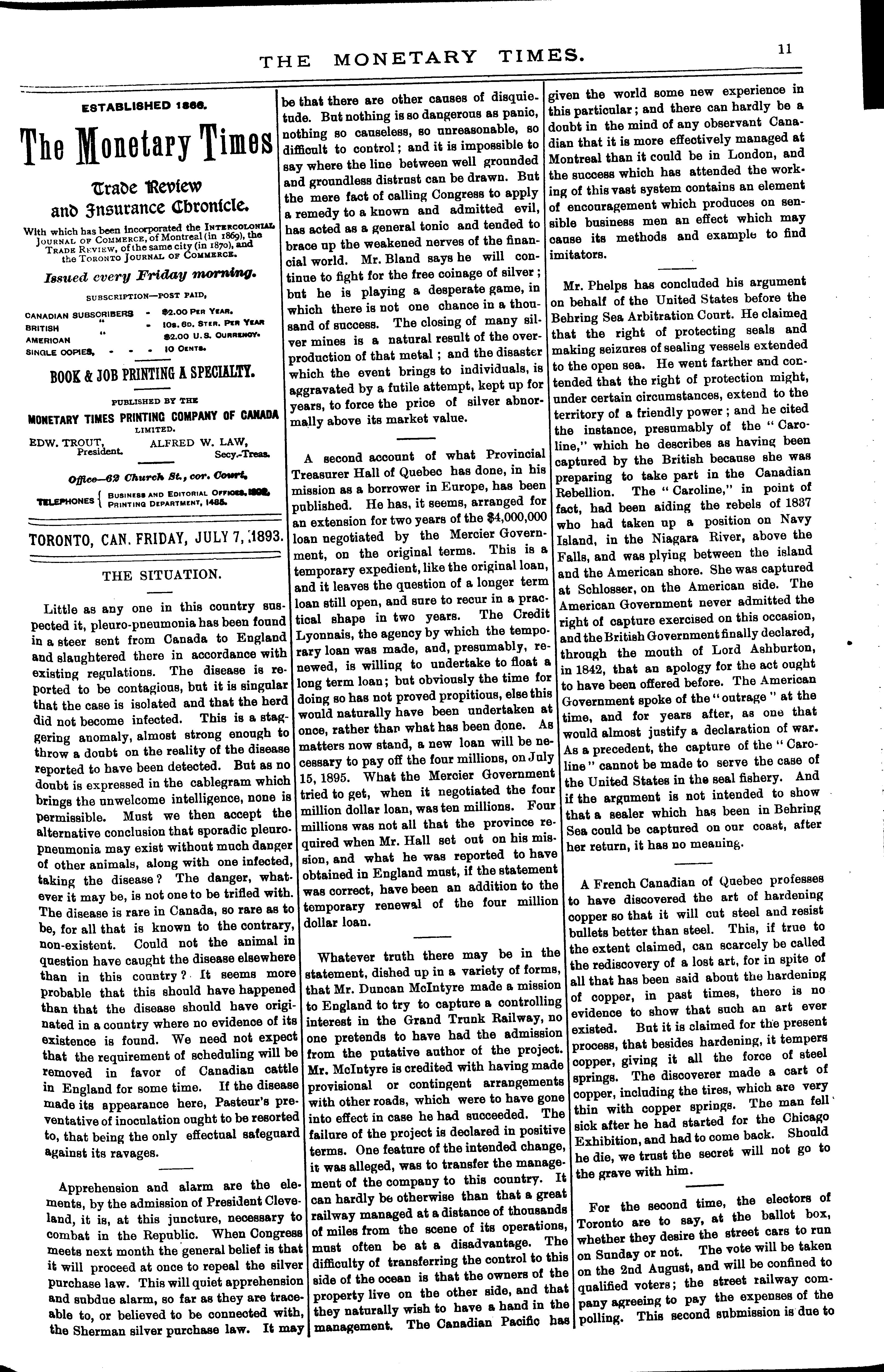 The monetary times, trade review and insurance chronicle : [Vol. 27, no. 1 (July 7, 1893)]