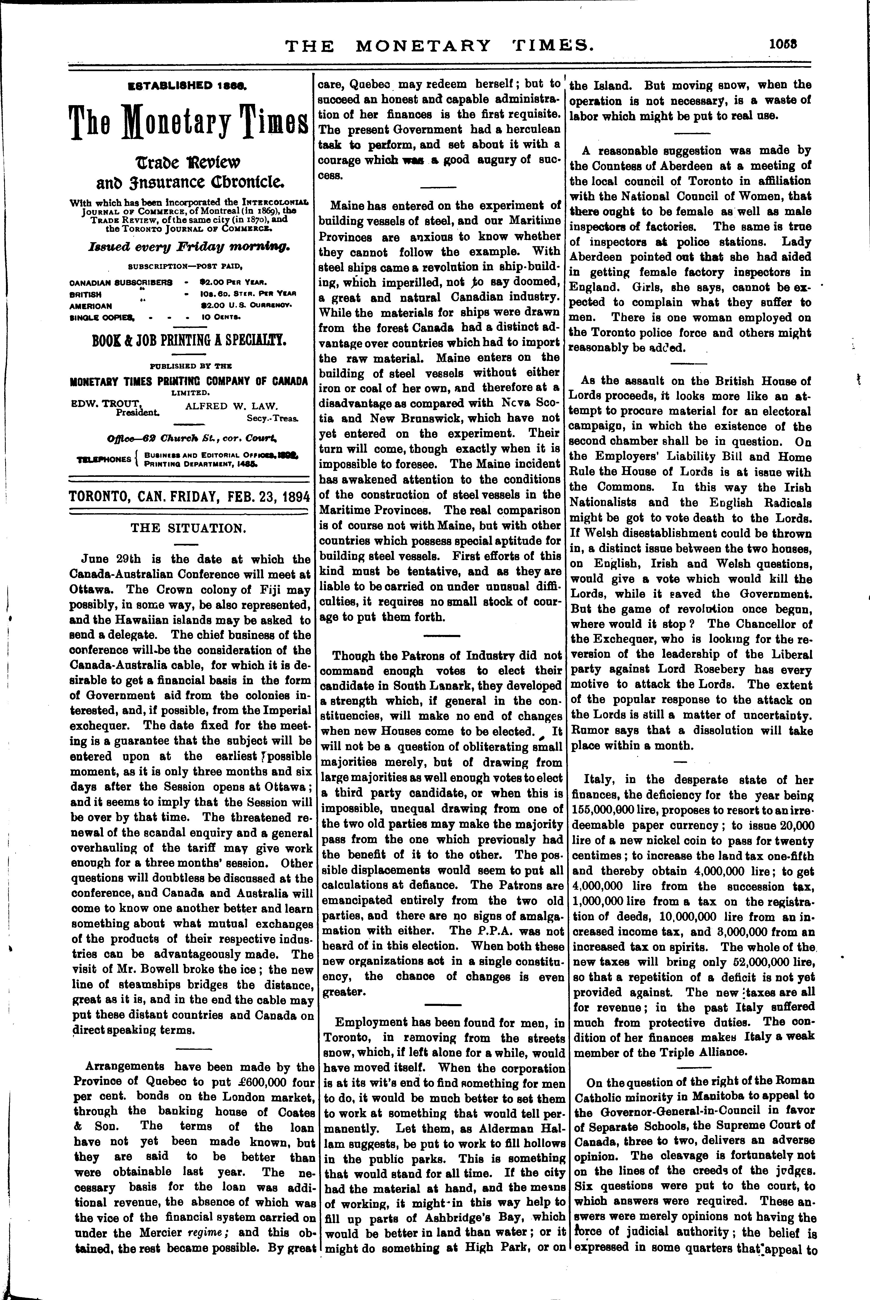 The monetary times, trade review and insurance chronicle : [Vol. 27, no. 34 (Feb. 23, 1894)]