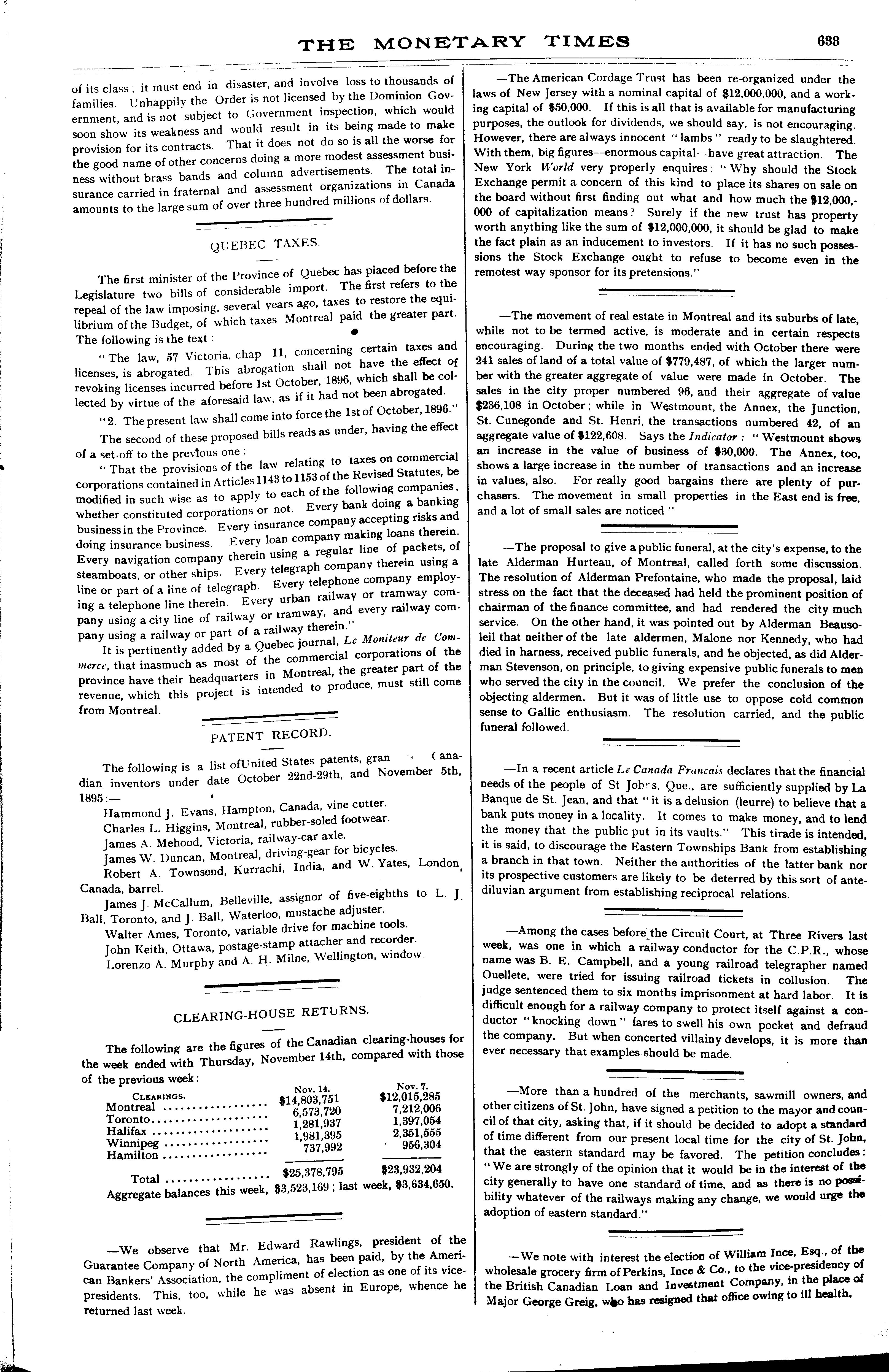 The monetary times, trade review and insurance chronicle : [Vol. 29, no. 20 (Nov. 15, 1895)]