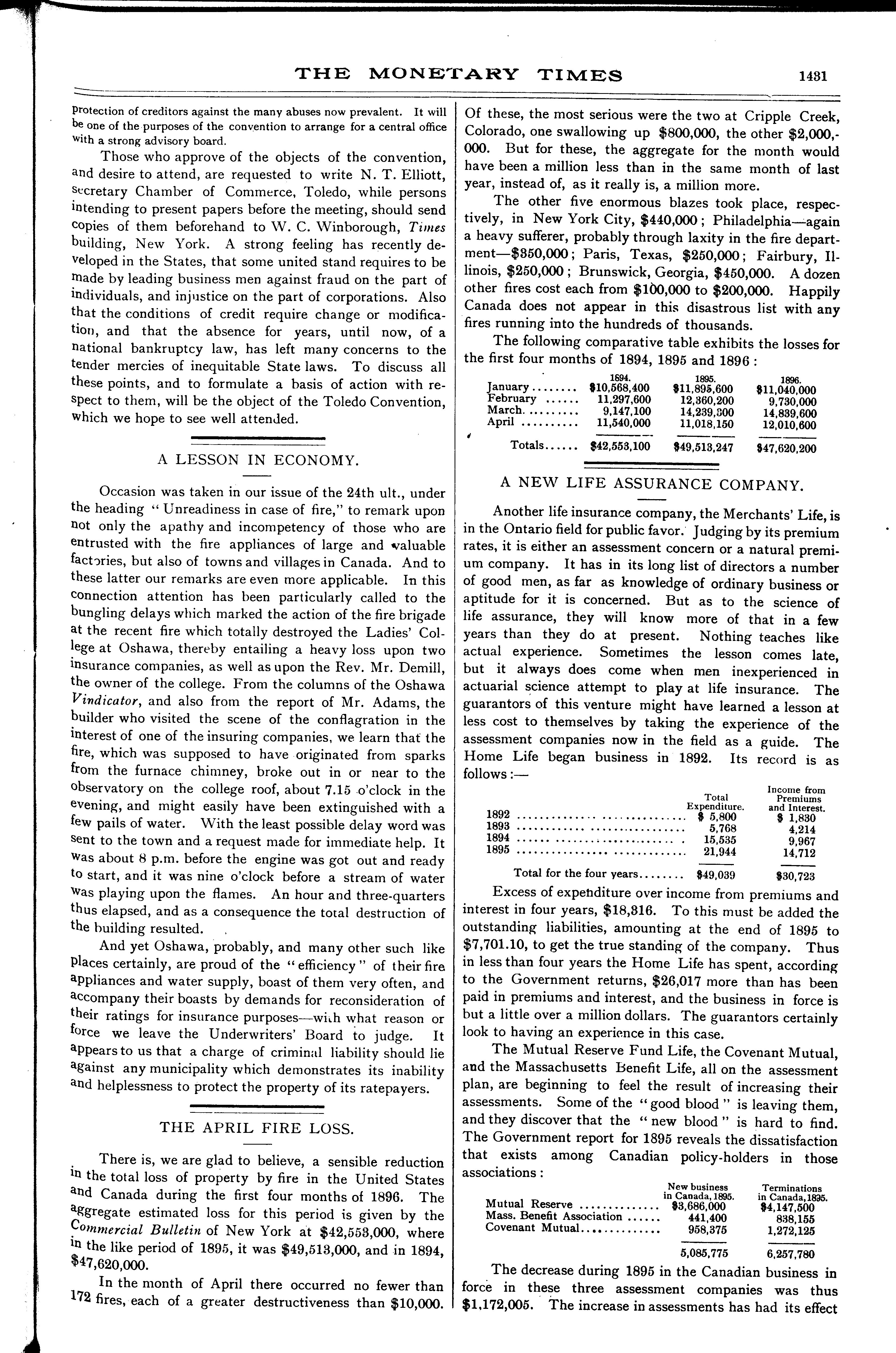 The monetary times, trade review and insurance chronicle : [Vol. 29, no. 45 (May 8, 1896)]