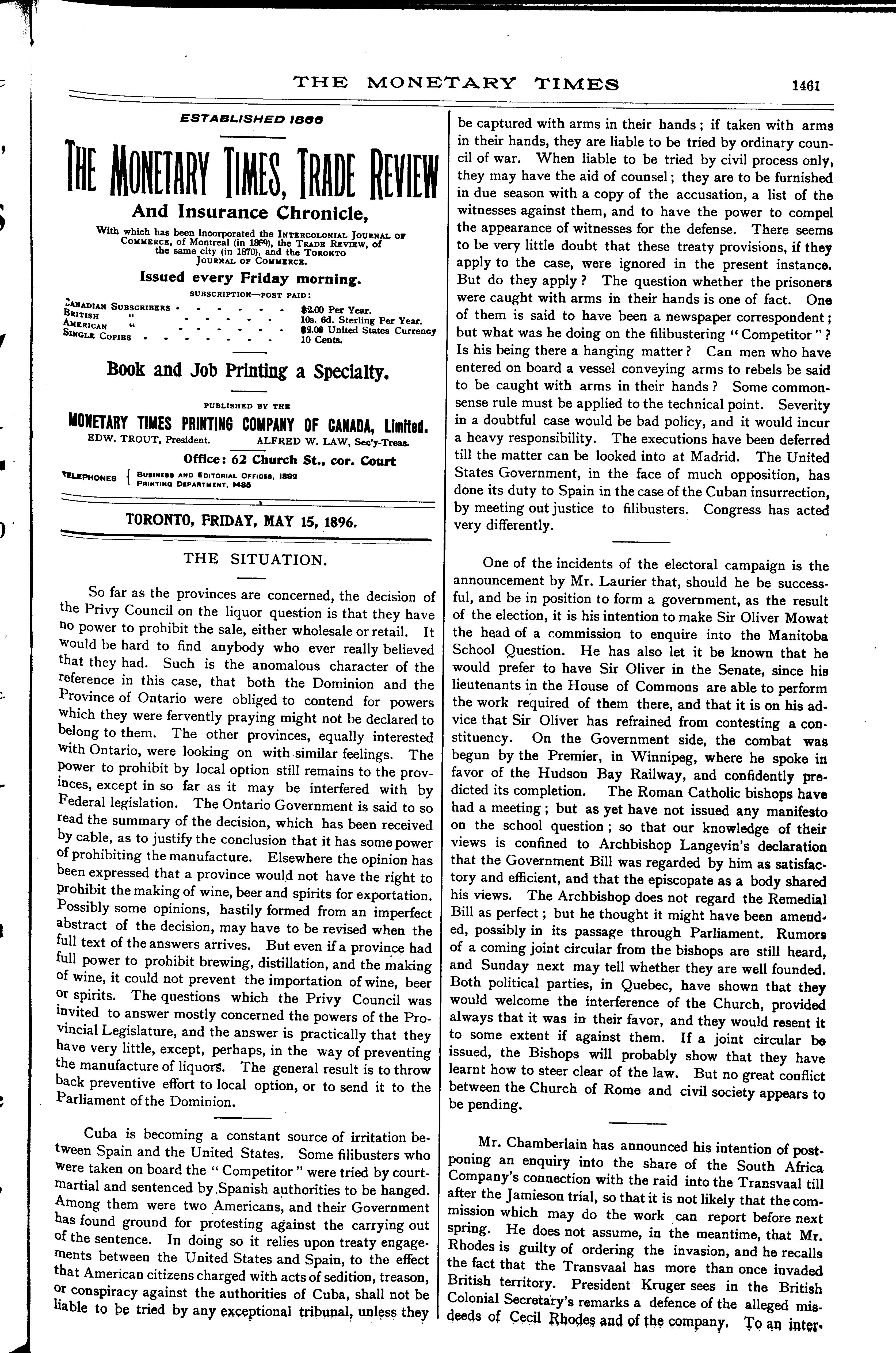 The monetary times, trade review and insurance chronicle : [Vol. 29, no. 46 (May 15, 1896)]