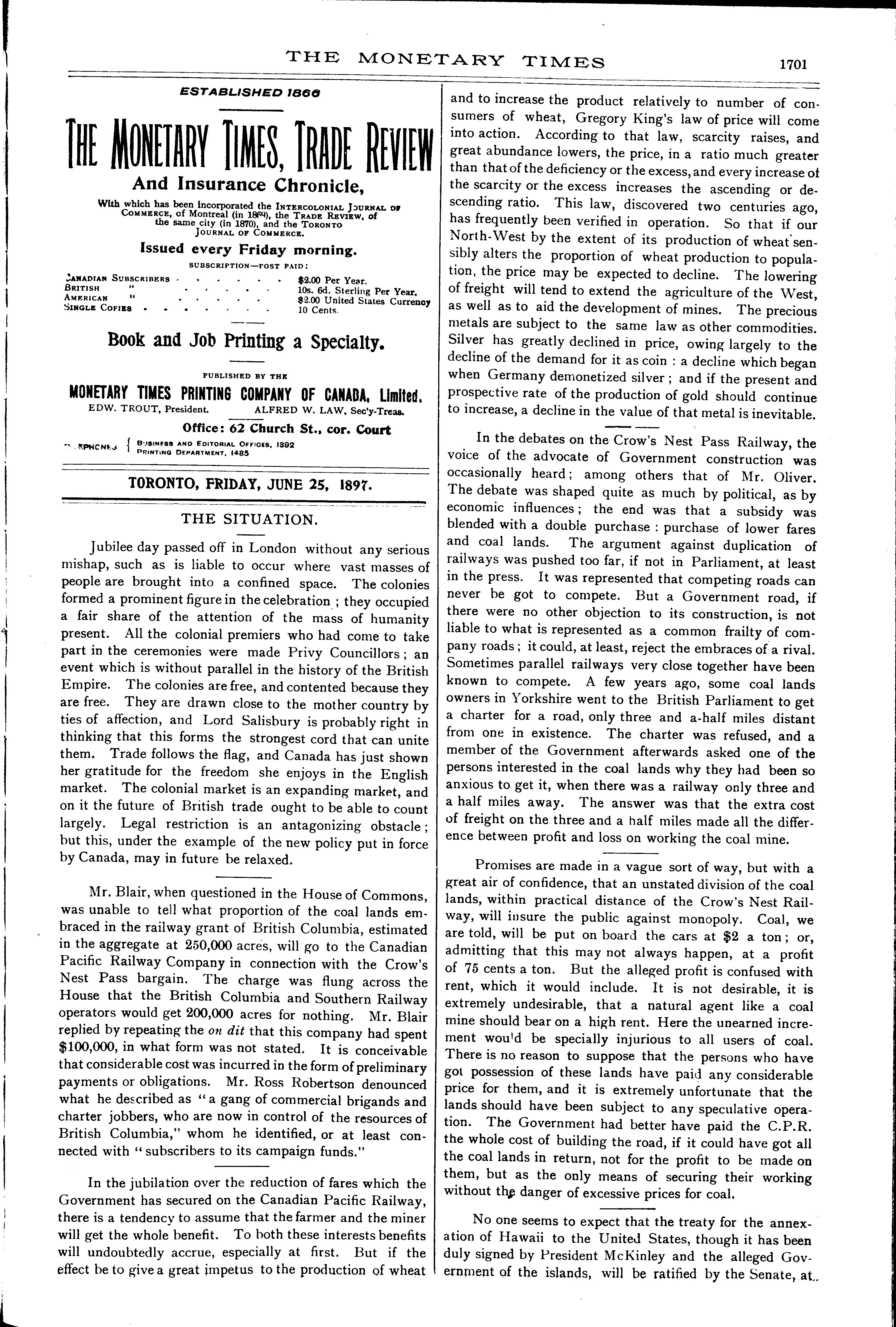 The monetary times, trade review and insurance chronicle : [Vol. 30, no. 52 (June 25, 1897)]
