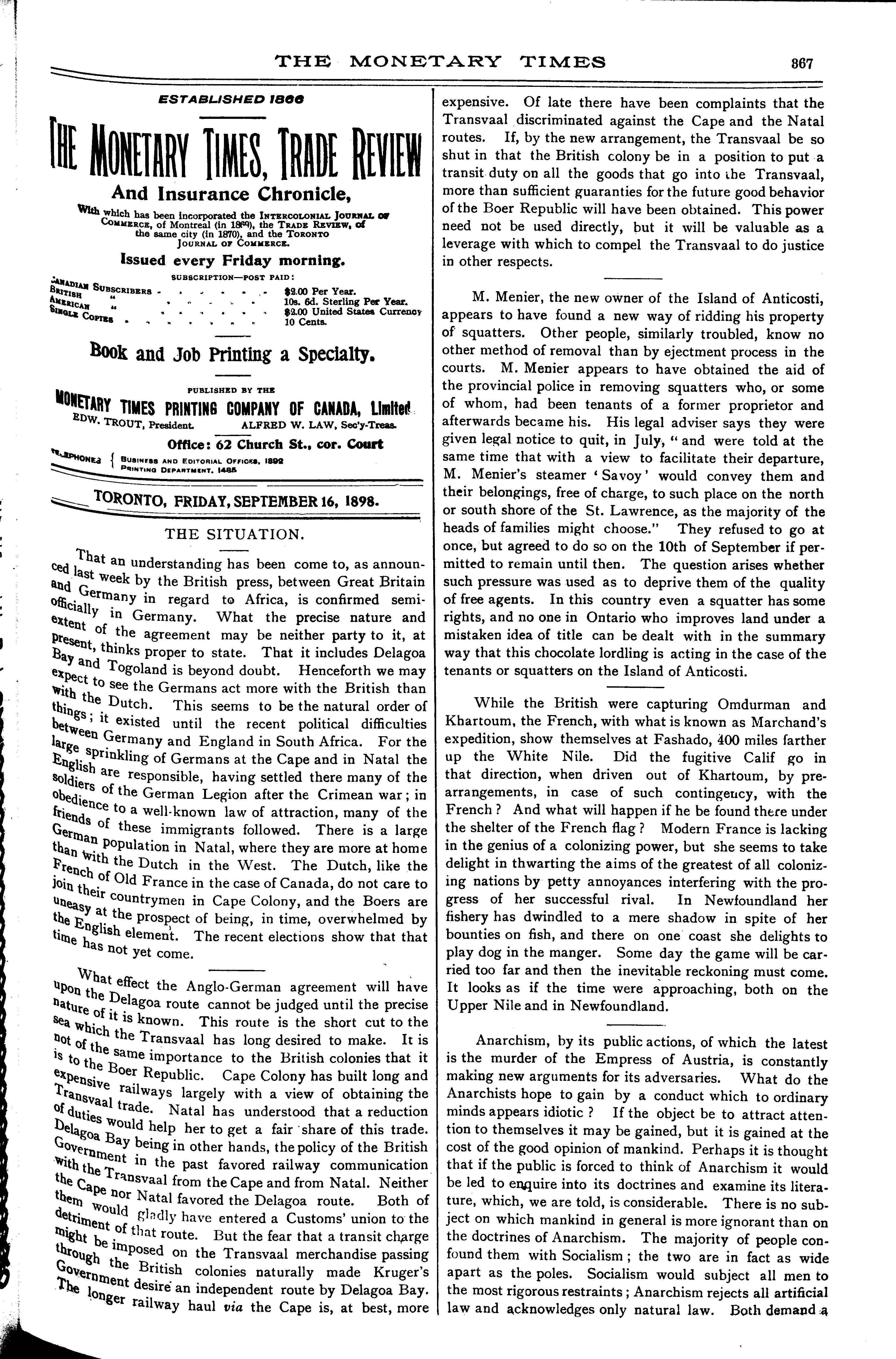 The monetary times, trade review and insurance chronicle : [Vol. 32, no. 12 (Sept. 16, 1898)]