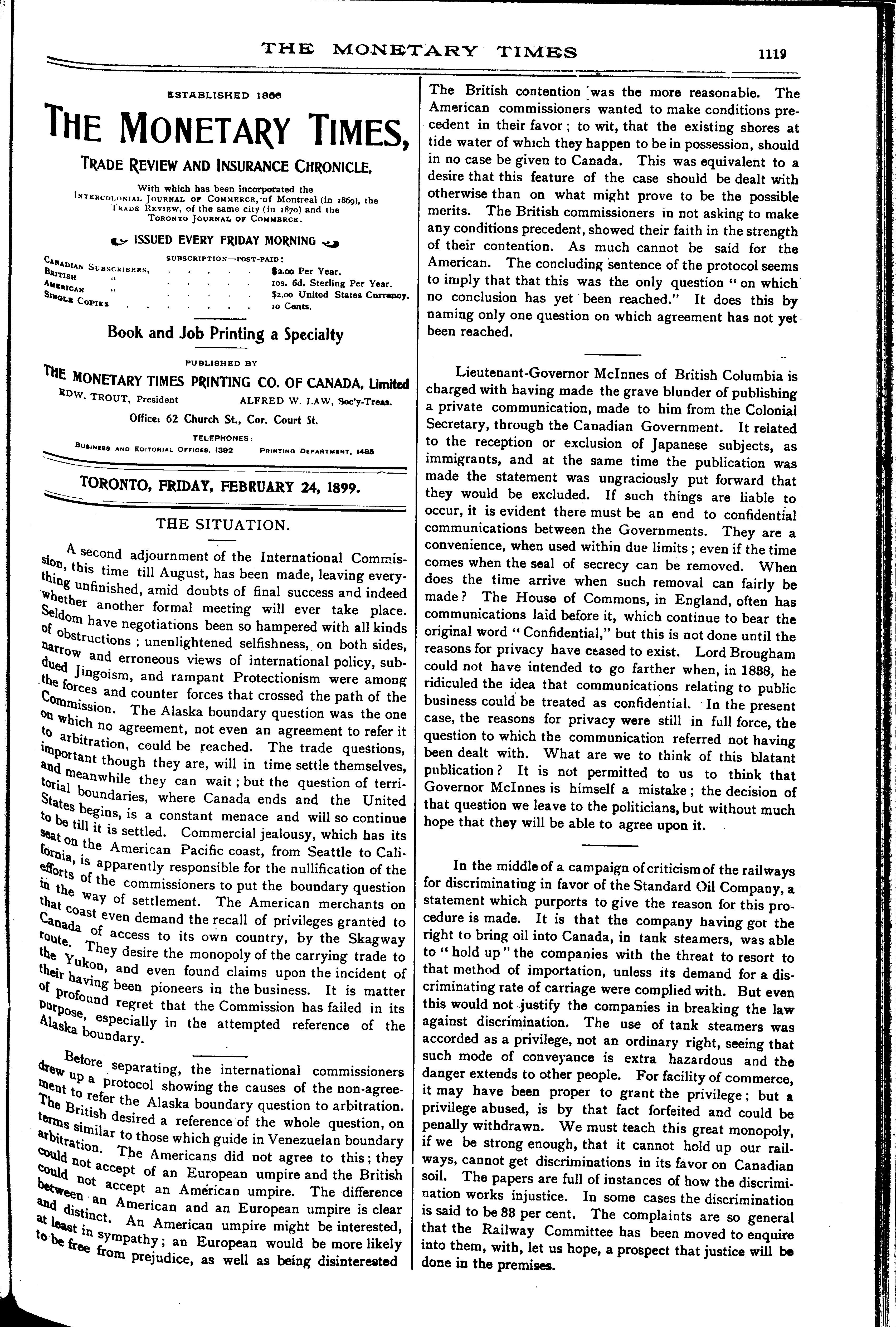 The monetary times, trade review and insurance chronicle : [Vol. 32, no. 35 (Feb. 24, 1899)]