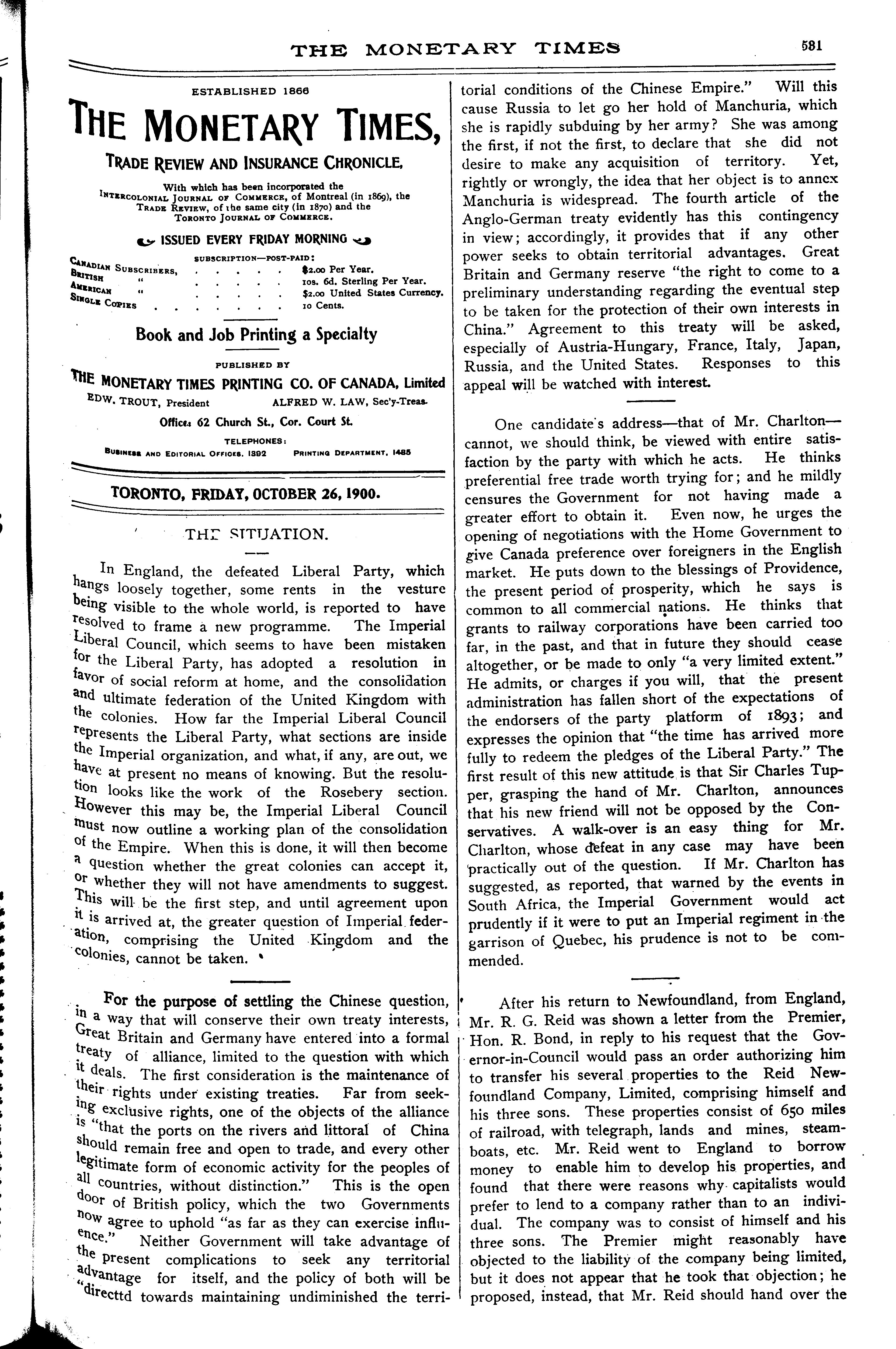 The monetary times, trade review and insurance chronicle : [Vol. 34, no. 17 (Oct. 26, 1900)]
