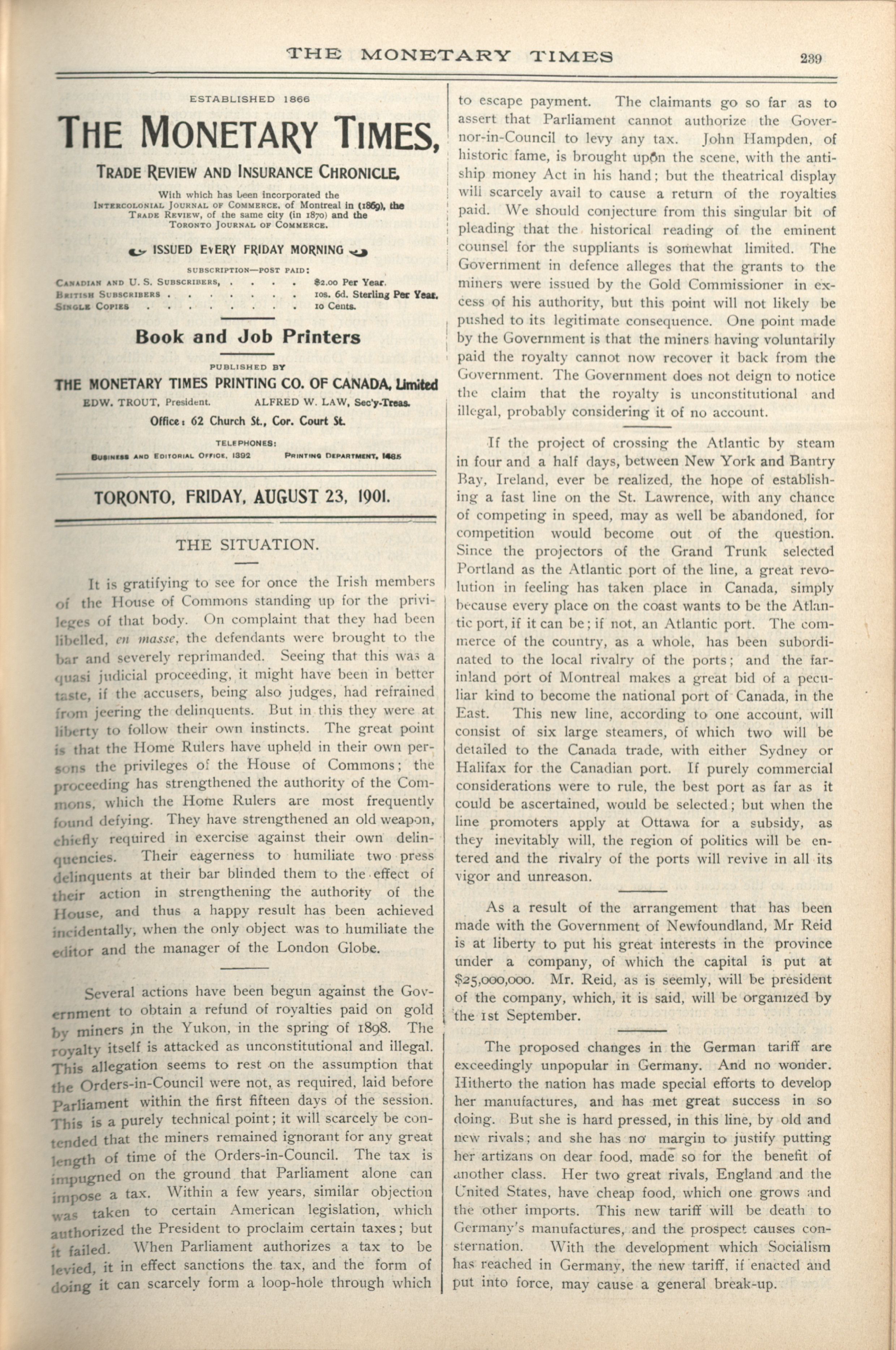 - The Monetary Times, trade review and insurance chronicle. : Vol. XXXV No. 8 (August 23, 1901)