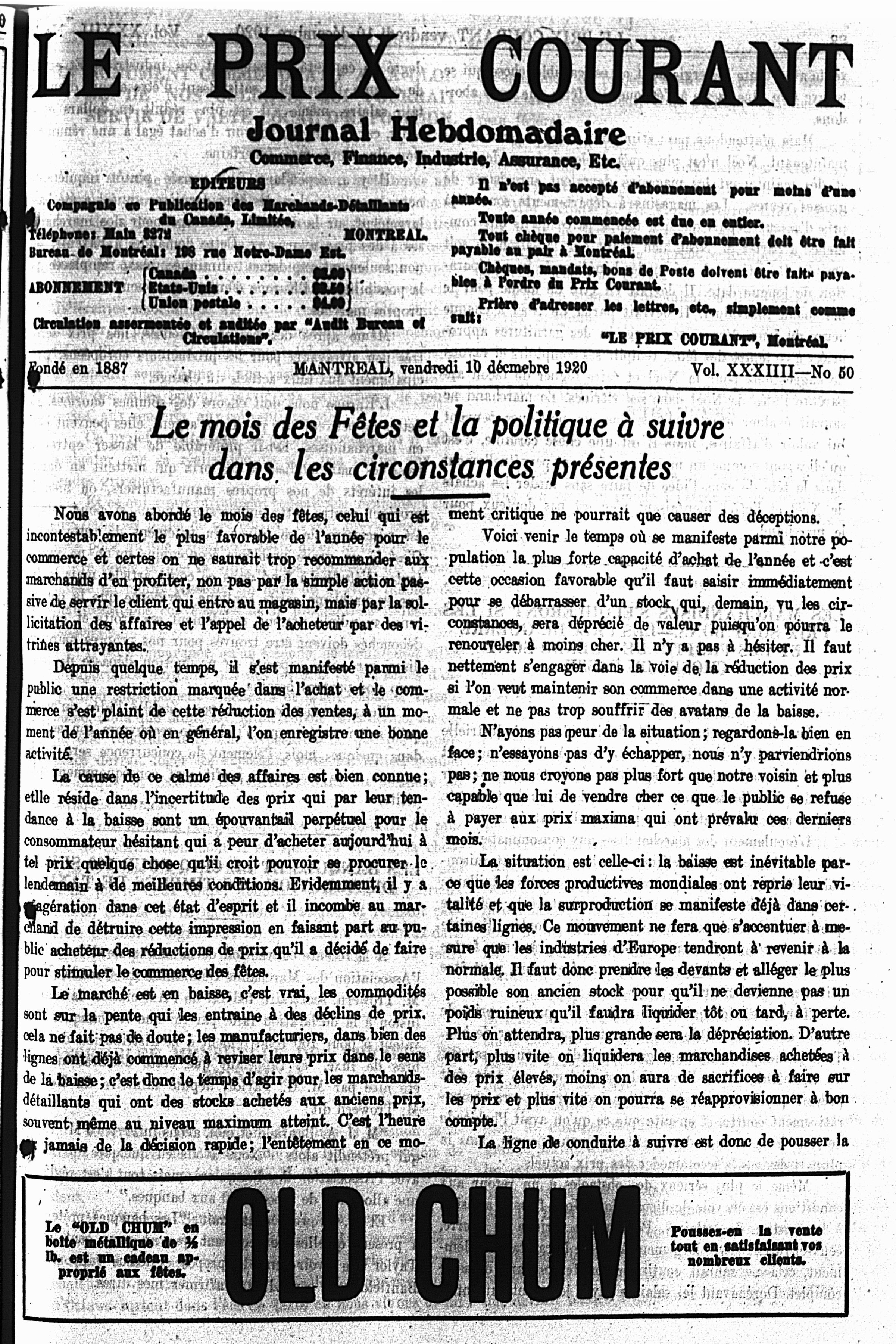 Le prix courant : Vol. 33, no 50 (10 déc. 1920)