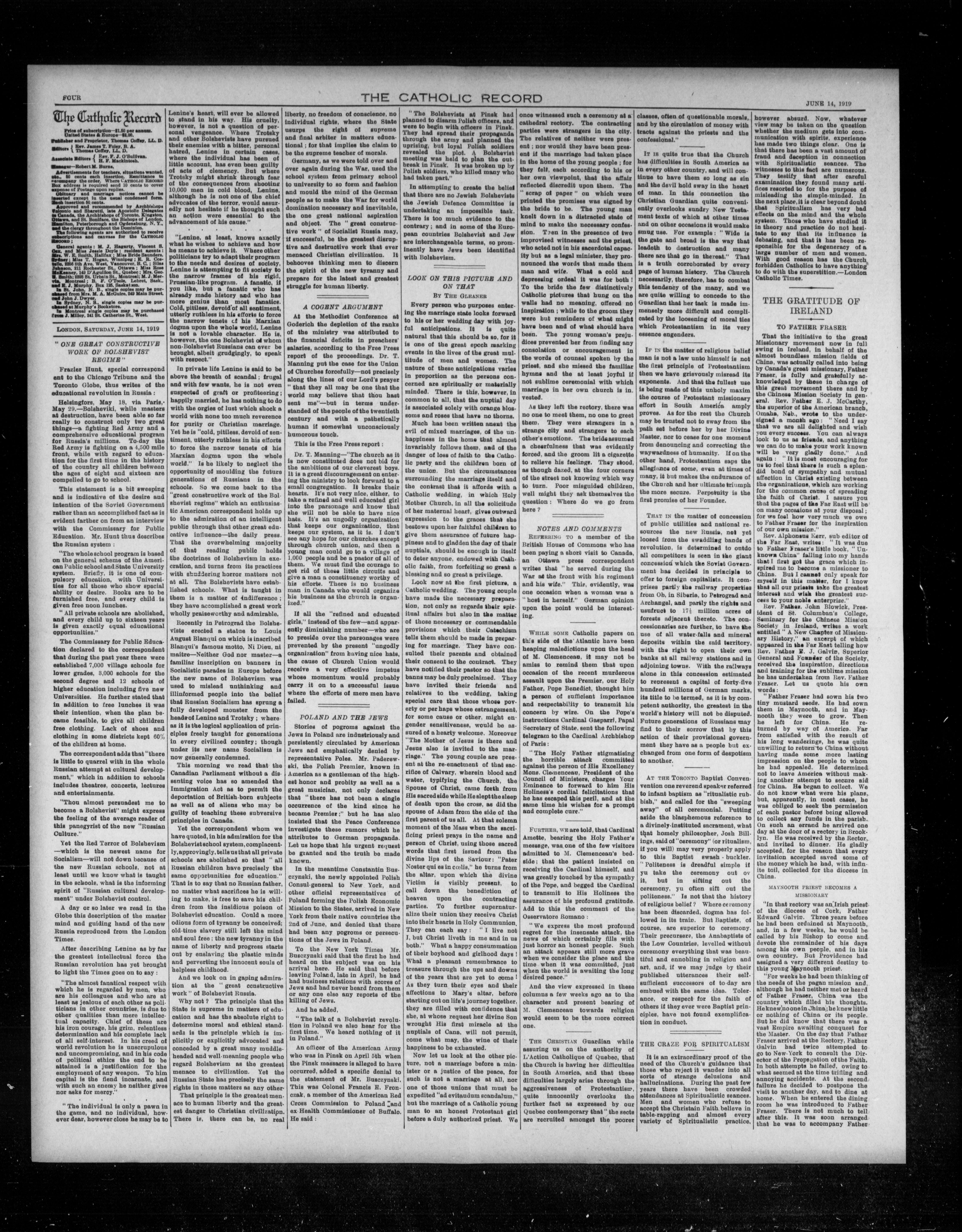 The Catholic record : Volume XXXXI [i.e. XLI], [No.] 2122 (June 14, 1919)