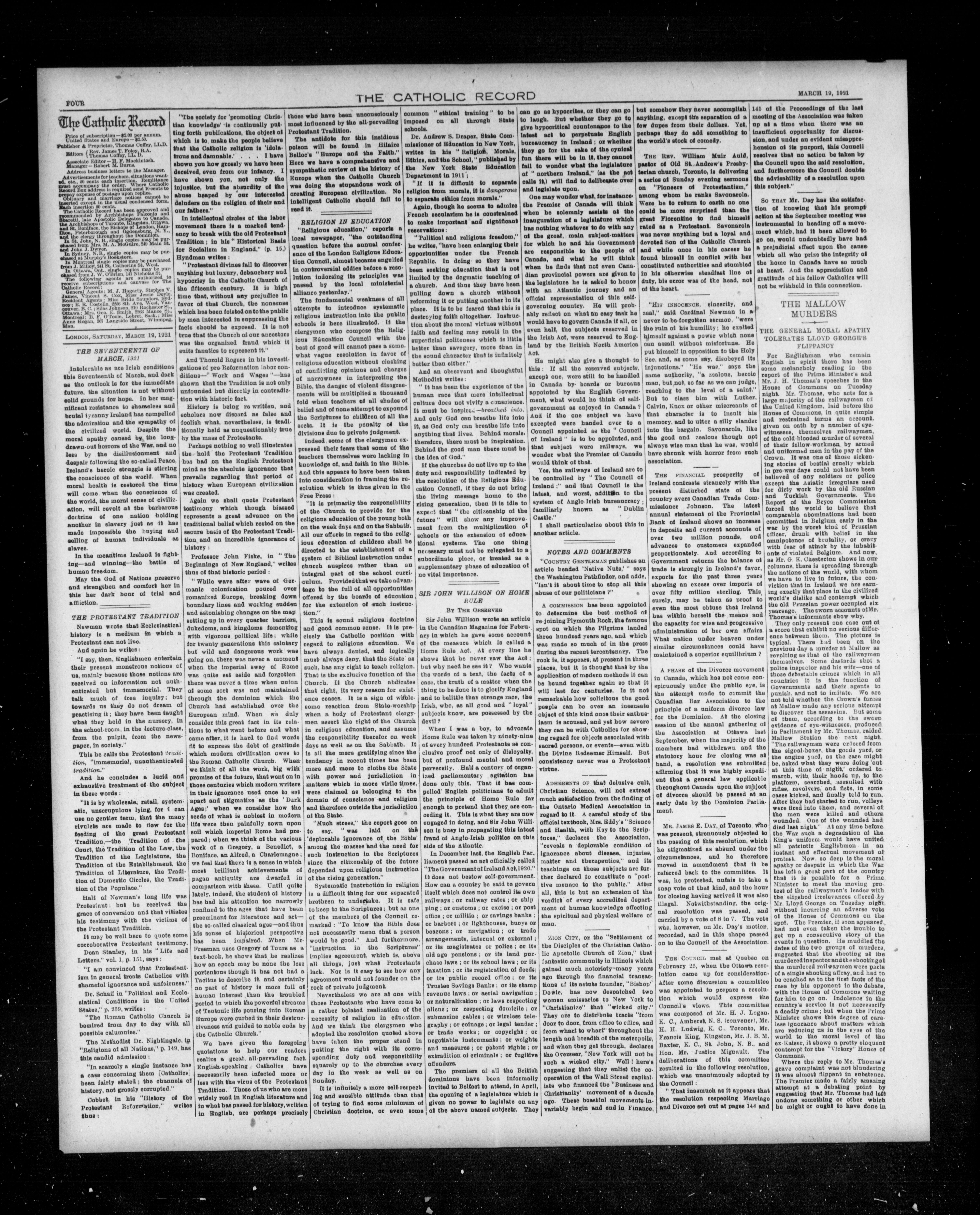 The Catholic record : Volume XXXXIII [i.e. XLIII], [No.] 2214 (March 19, 1921)