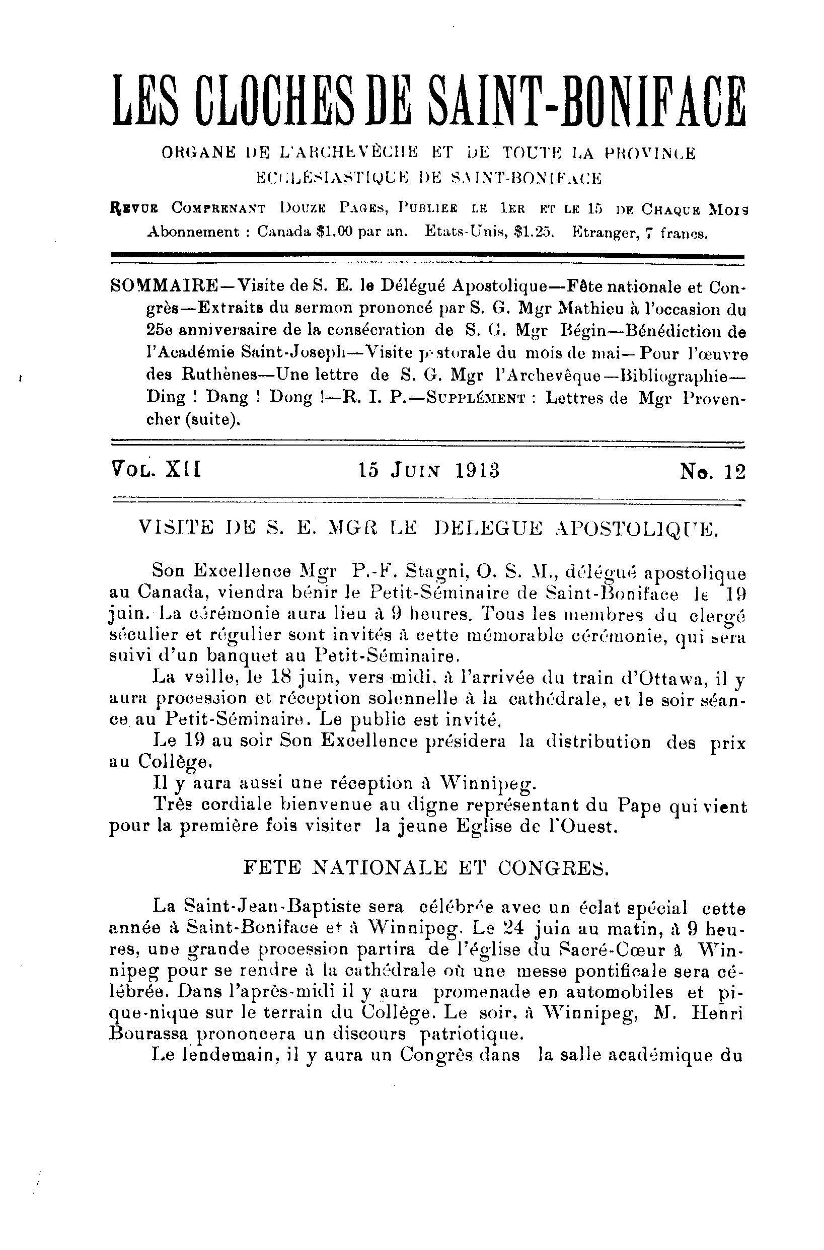 - Les cloches de Saint-Boniface : Vol. 12, no 12 (15 juin 1913)