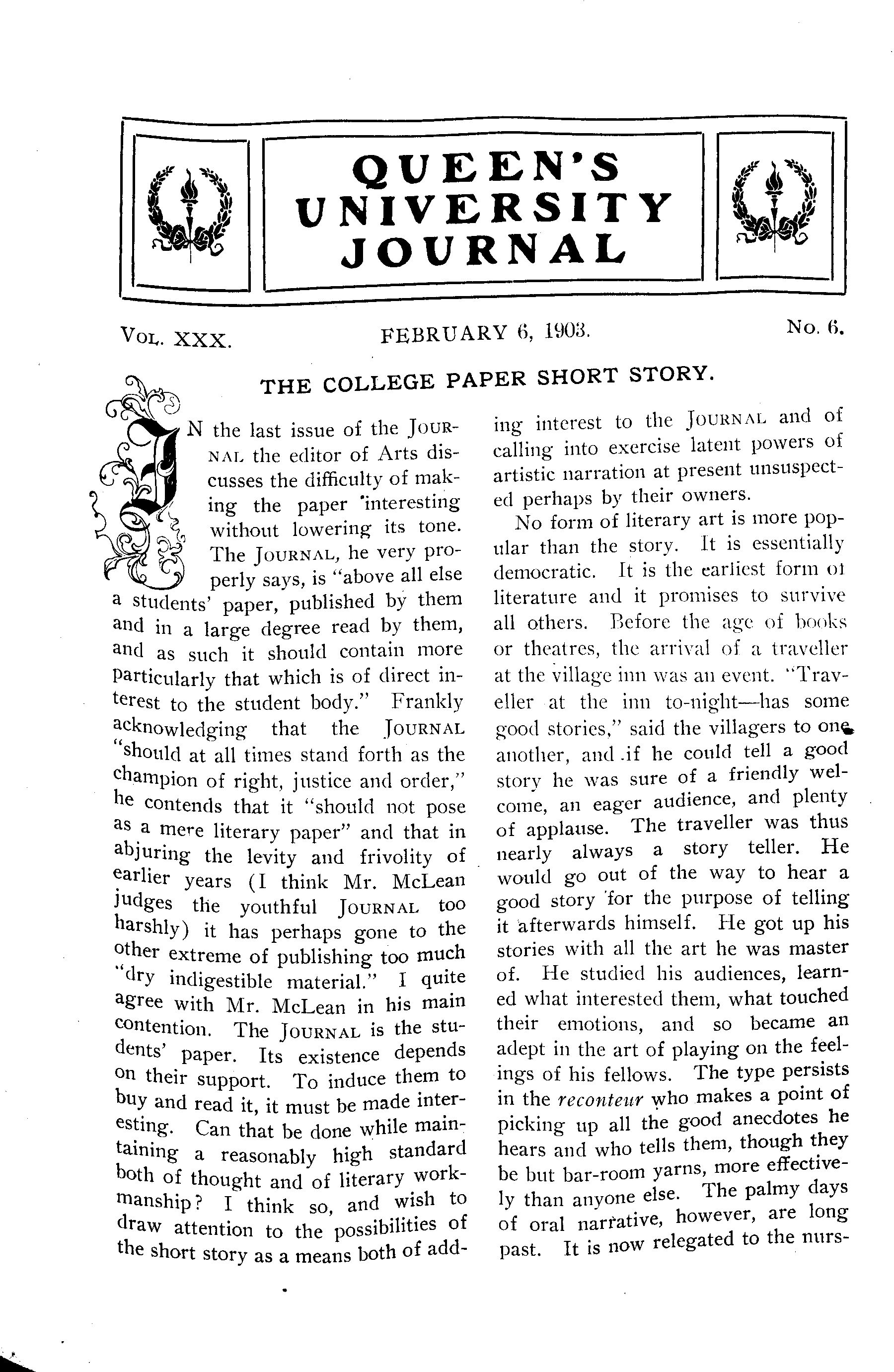 Queen's University journal : Vol. 30, no. 6 (Feb. 6, 1903)