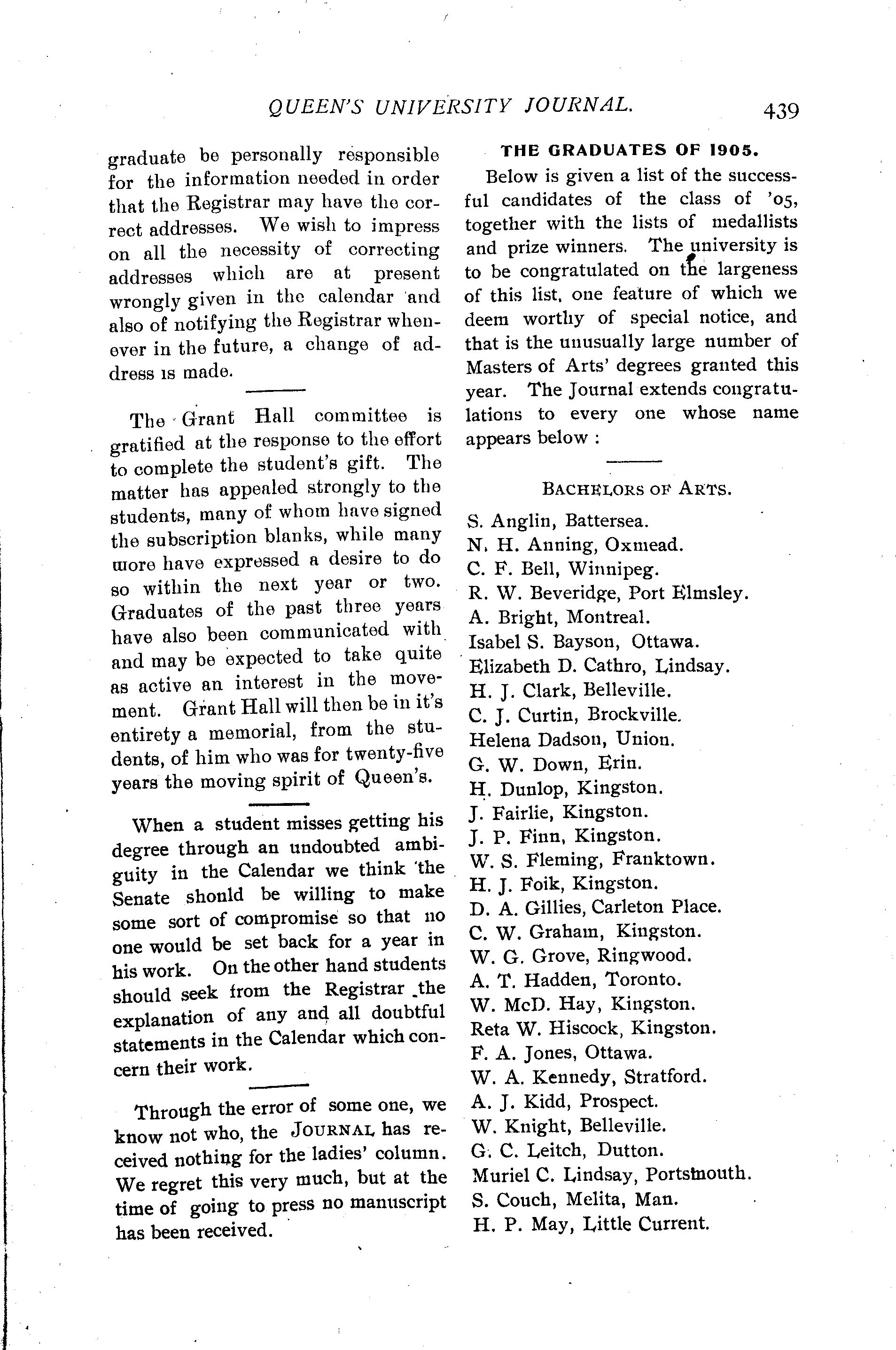 Queen's University journal : Vol. 32, no. 12 (May 1, 1905)
