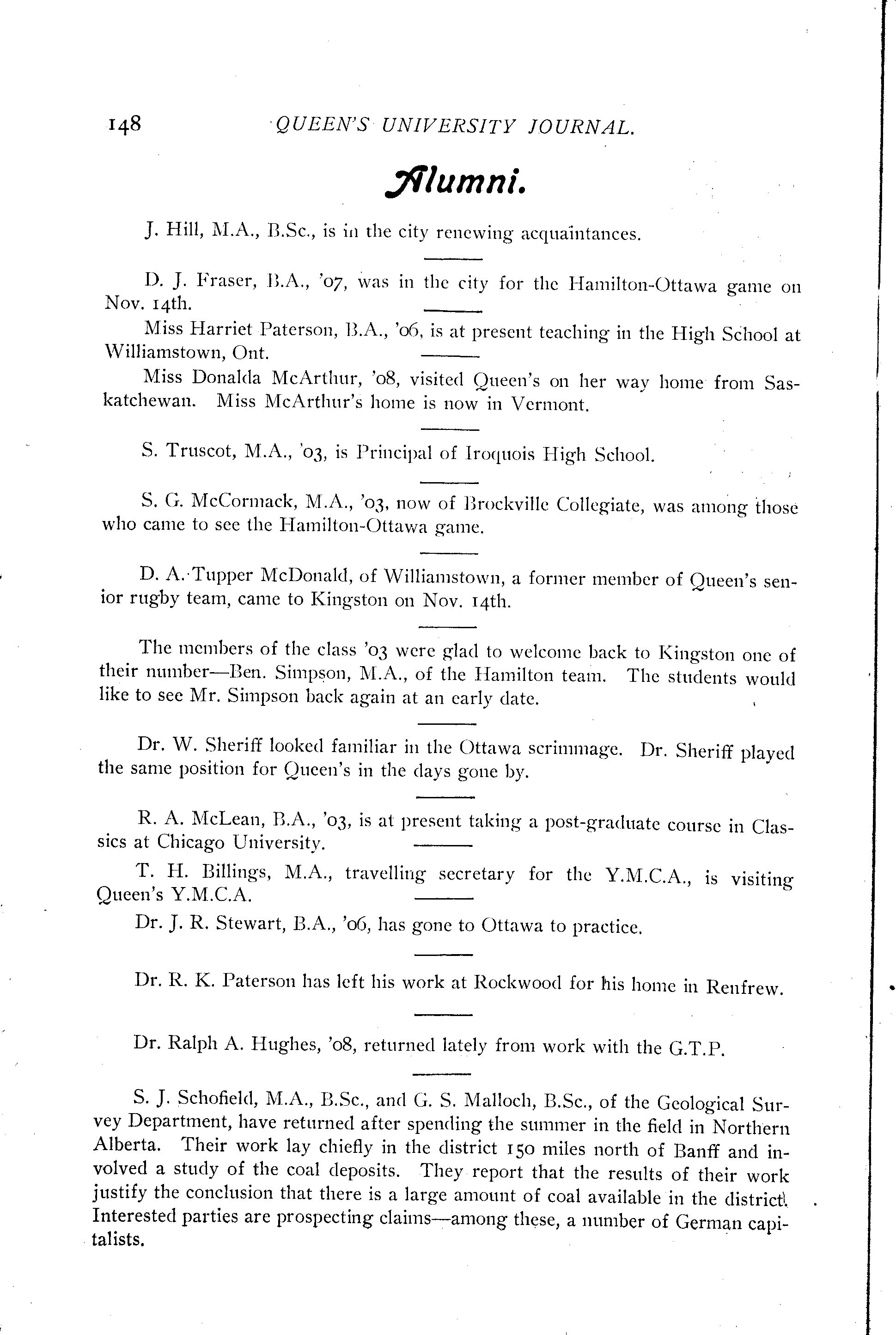 Kingston, Ont. : Alma Mater Society of Queen's University, [1908]; 56 images, 55 avec recherche en texte intégral