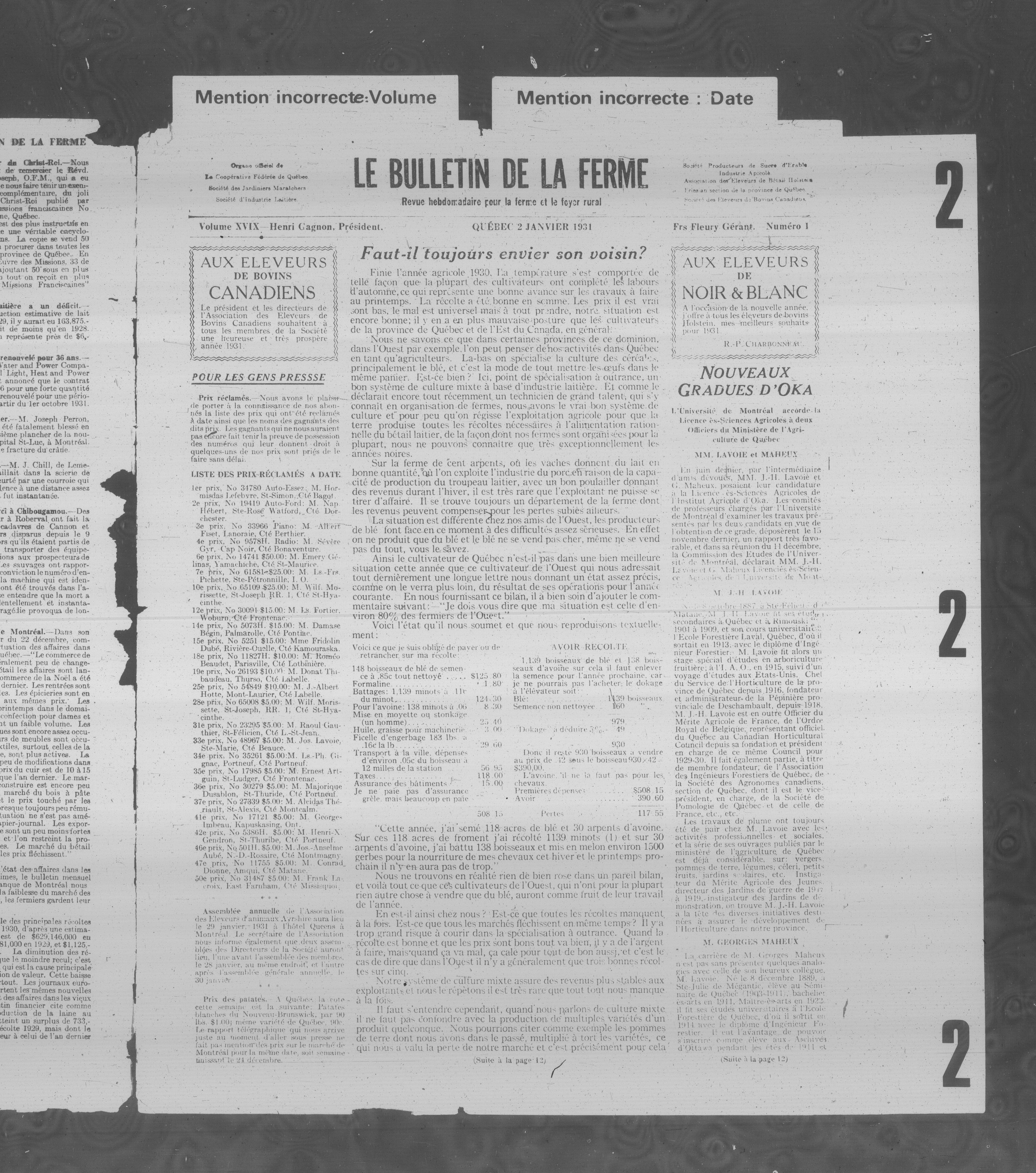 Le Bulletin de la ferme : Le Bulletin de la ferme : Volume XVIX, Numéro 1 (2 janvier 1931)