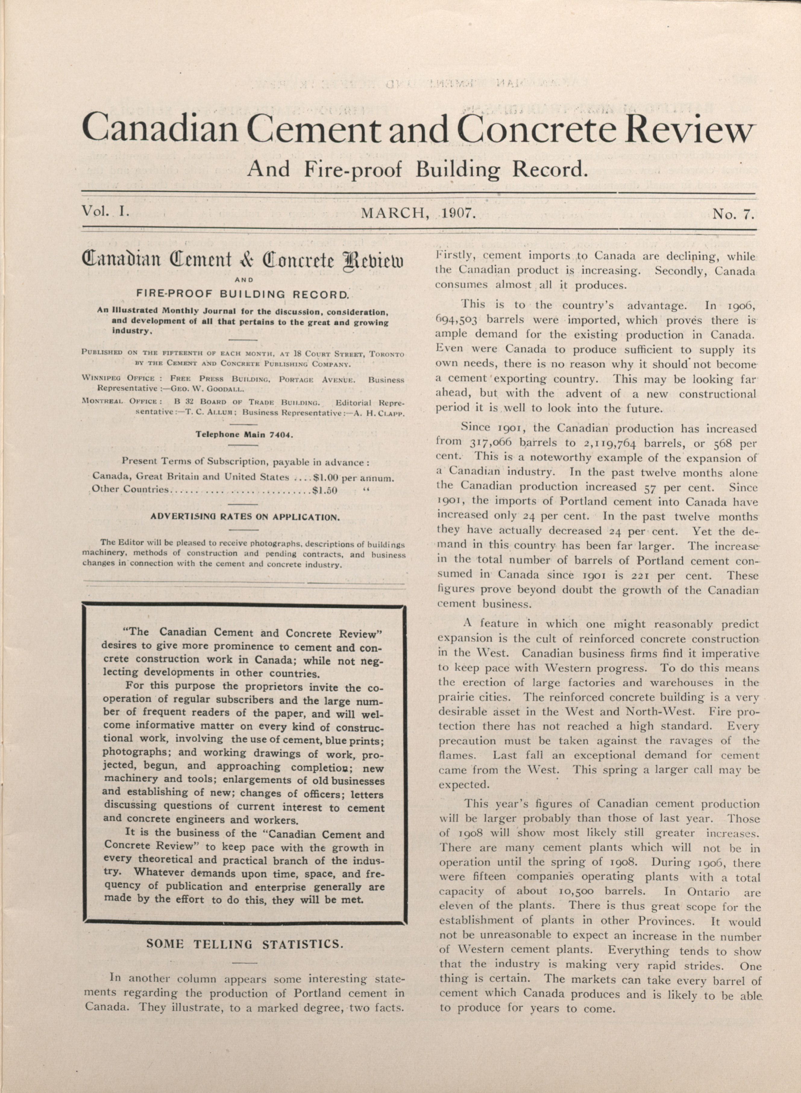 Canadian cement and concrete review. : Vol. I, No. 7 (March, 1907)