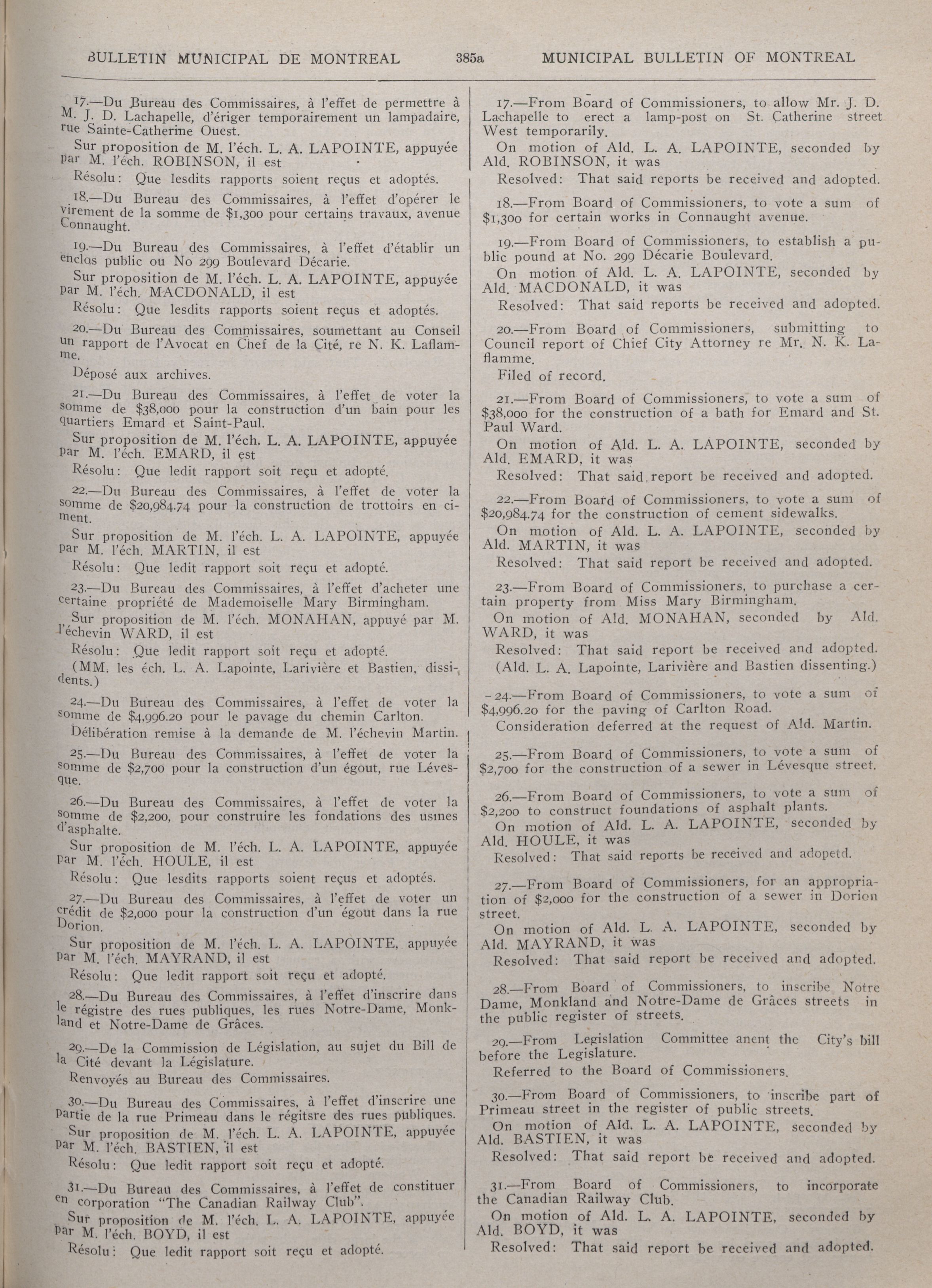 Municipal bulletin of the city of Montreal = : Première Année/First Year, No. 39 (27 Septembre/September 1913)