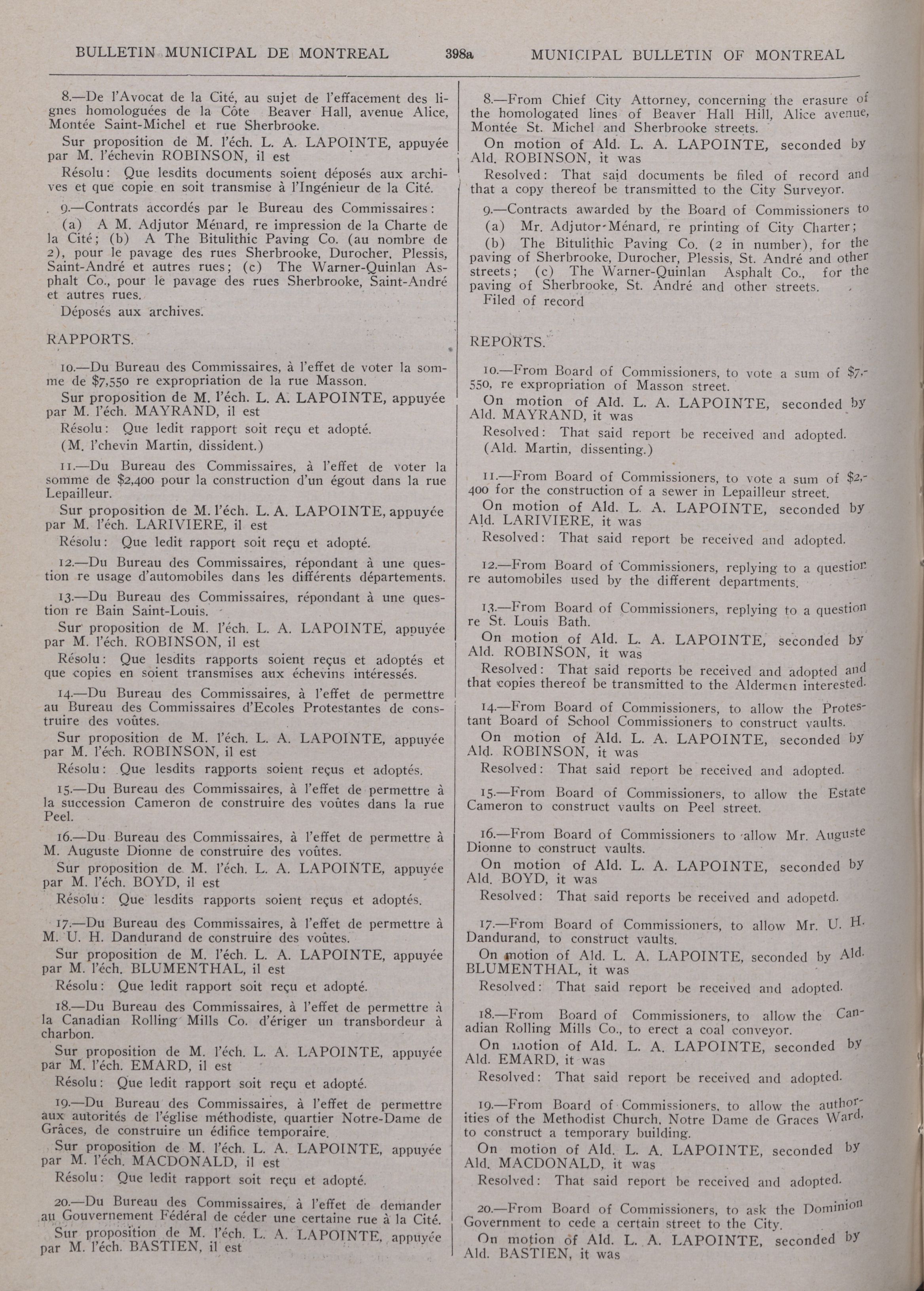 Municipal bulletin of the city of Montreal = : Première Année/First Year, No. 40 (4 Octobre/October 1913)