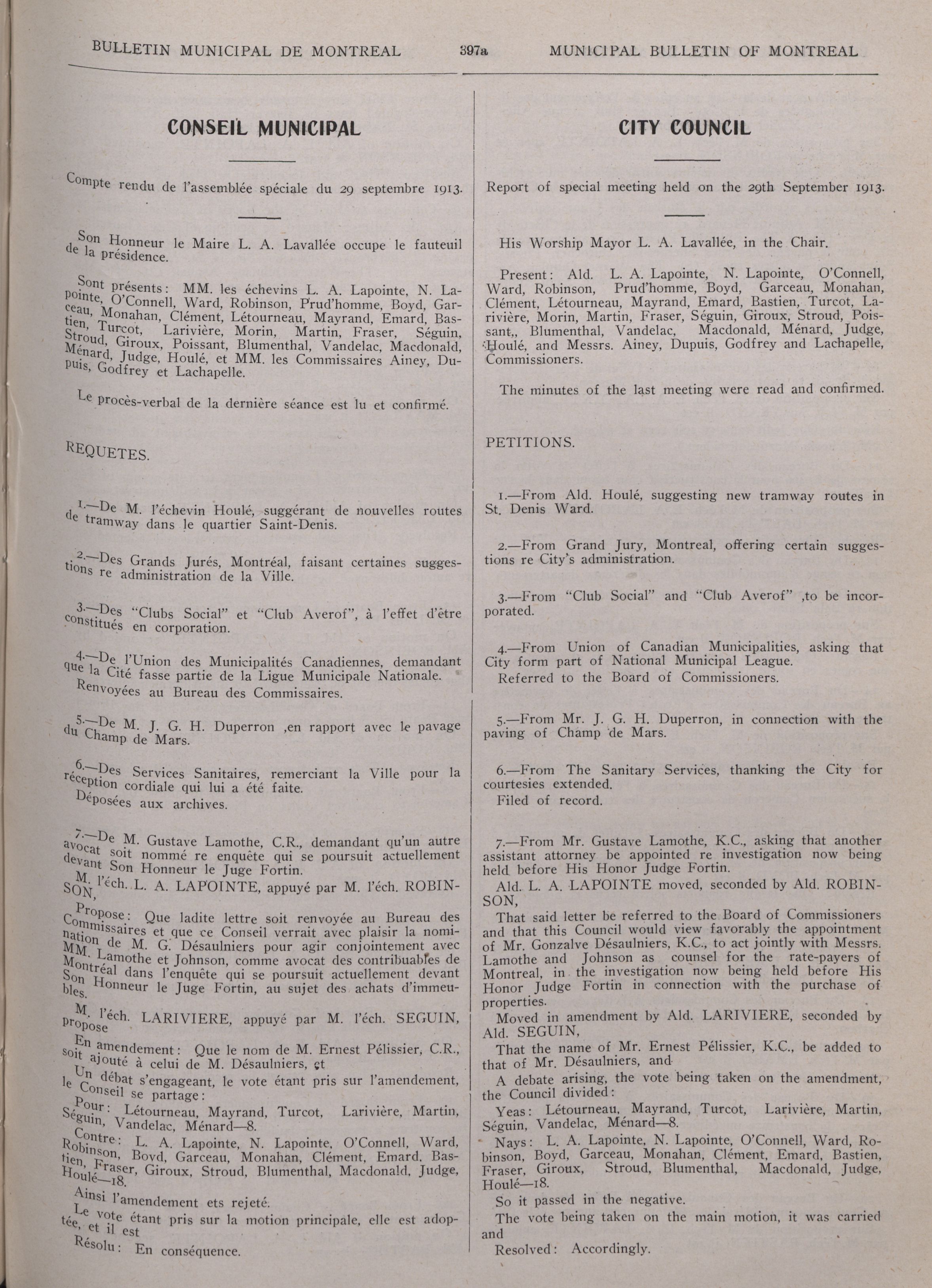 Municipal bulletin of the city of Montreal = : Première Année/First Year, No. 40 (4 Octobre/October 1913)