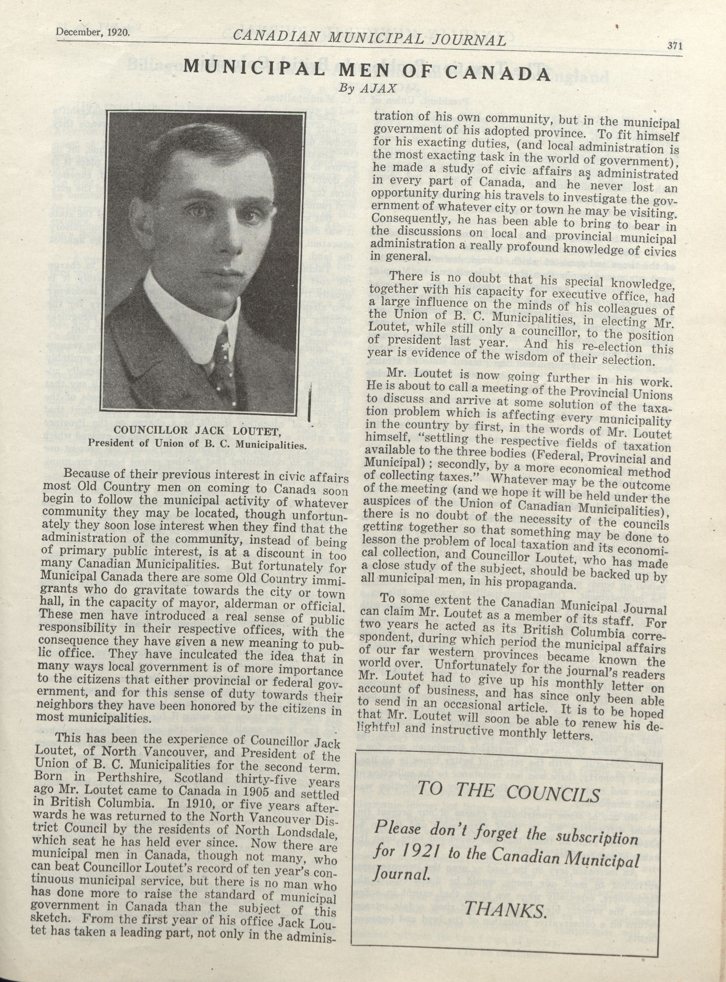 - The Canadian Municipal Journal. : Vol. XVI, No. 12 (December, 1920)