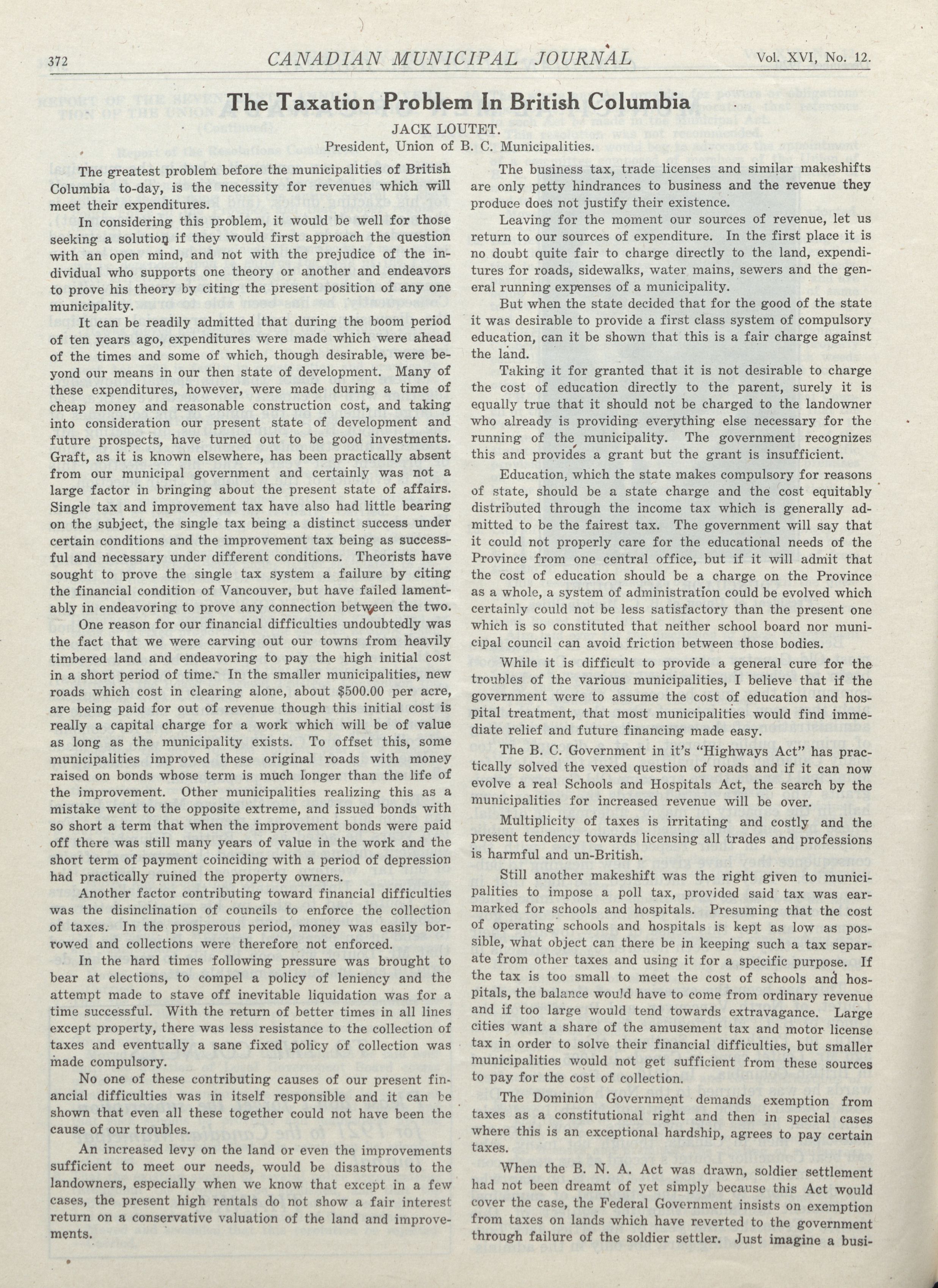 - The Canadian Municipal Journal. : Vol. XVI, No. 12 (December, 1920)
