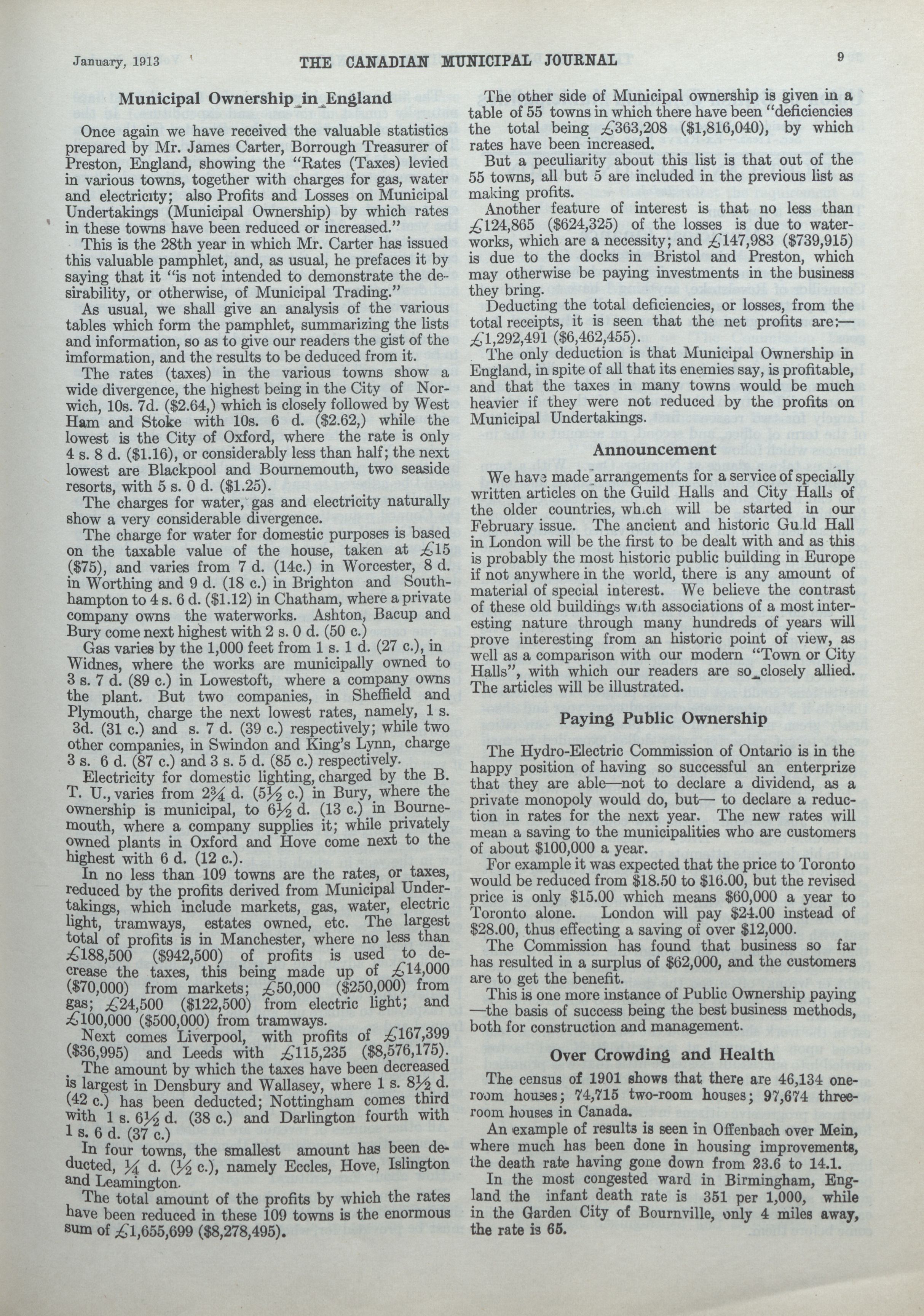 The Canadian Municipal Journal. : Vol. IX, No. 1 (January, 1913)