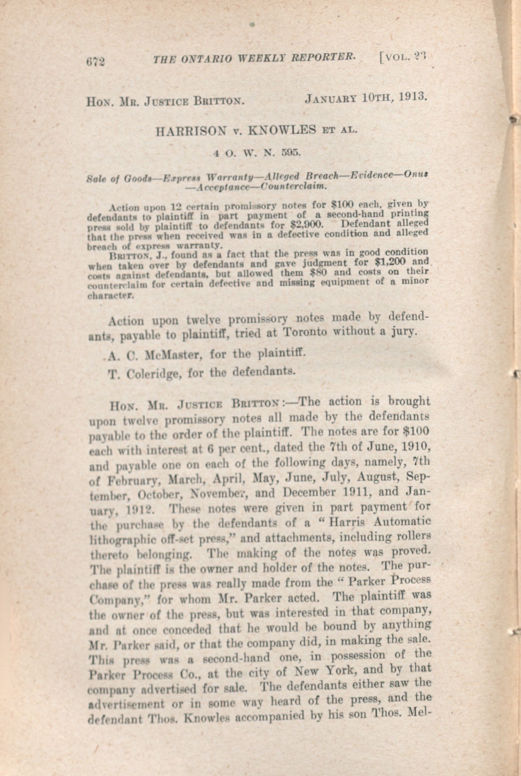 The Ontario weekly reporter. : Vol. 23 No. 14 (January 30, 1913.)