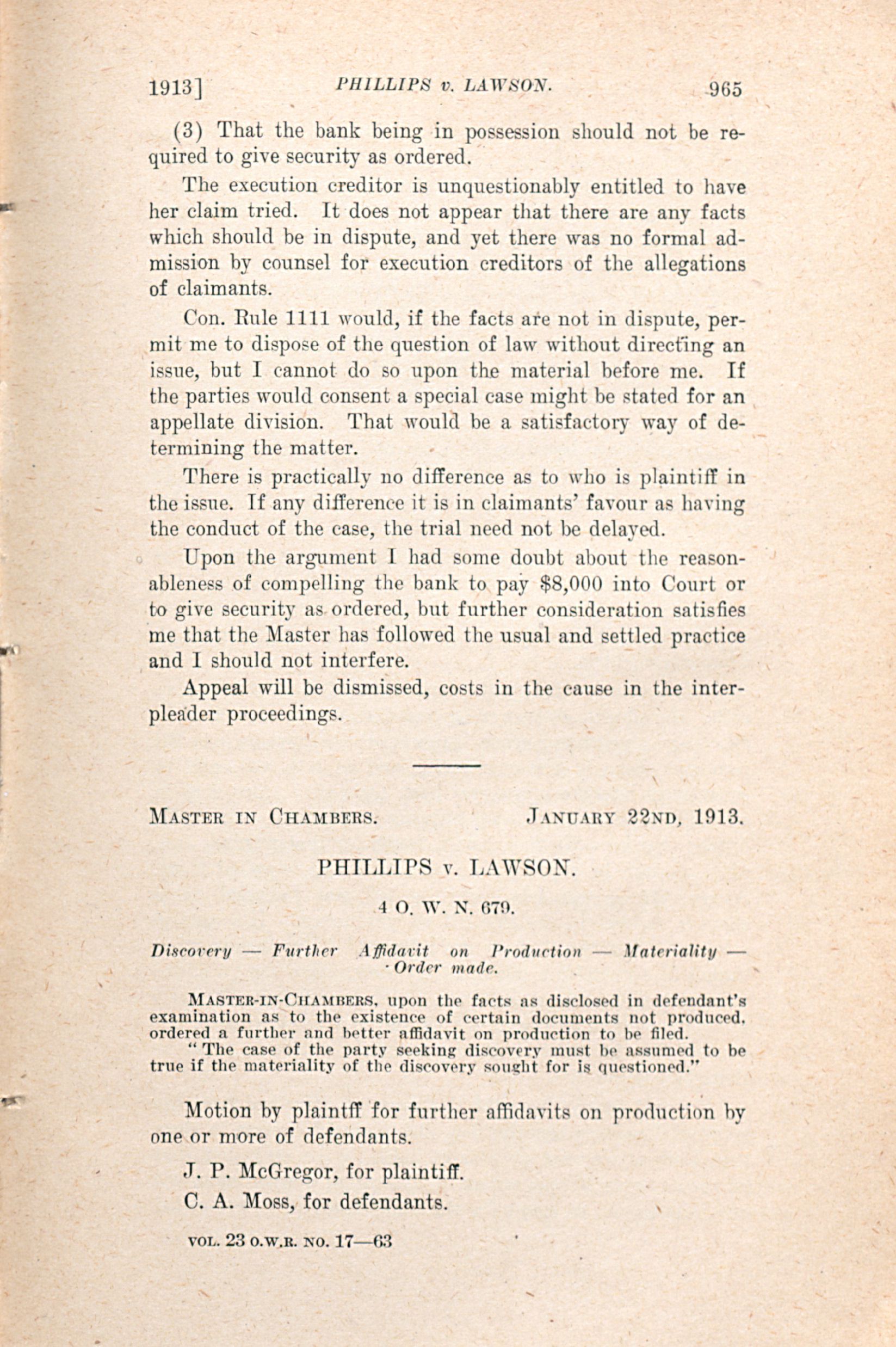 - The Ontario weekly reporter. : Vol. 23 No. 17 (February 20, 1913.)