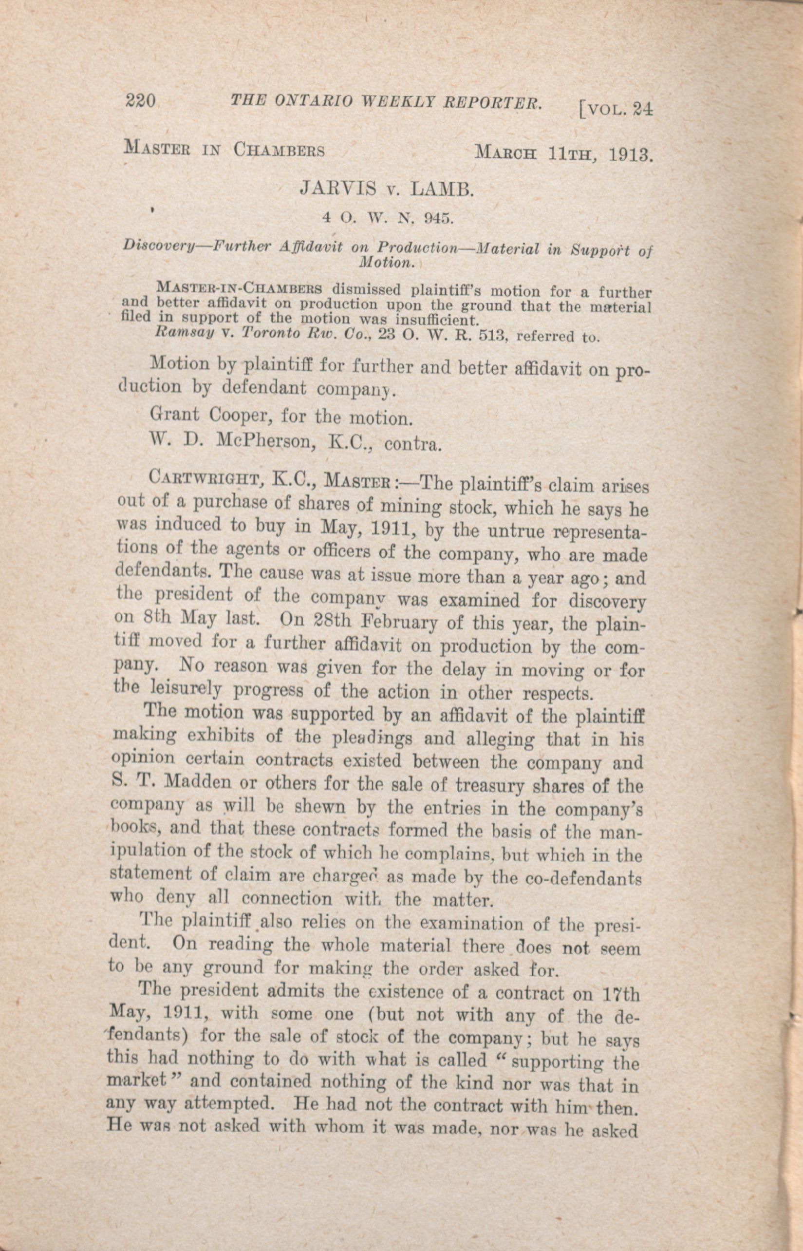 The Ontario weekly reporter. : Vol. 24 No. 4 (March 27, 1913.)
