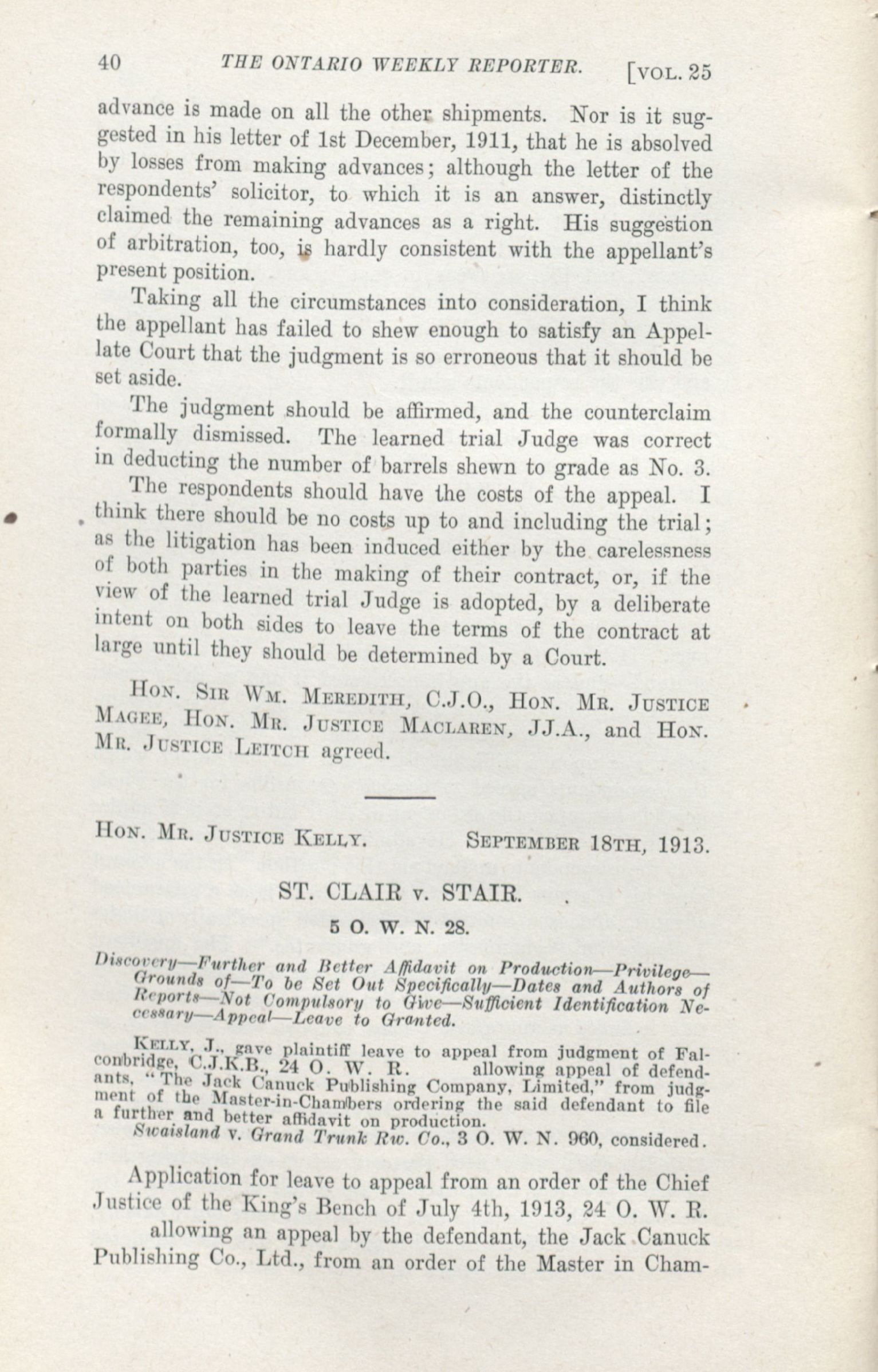 The Ontario weekly reporter. : Vol. 25 No. 1 (October 16, 1913.)
