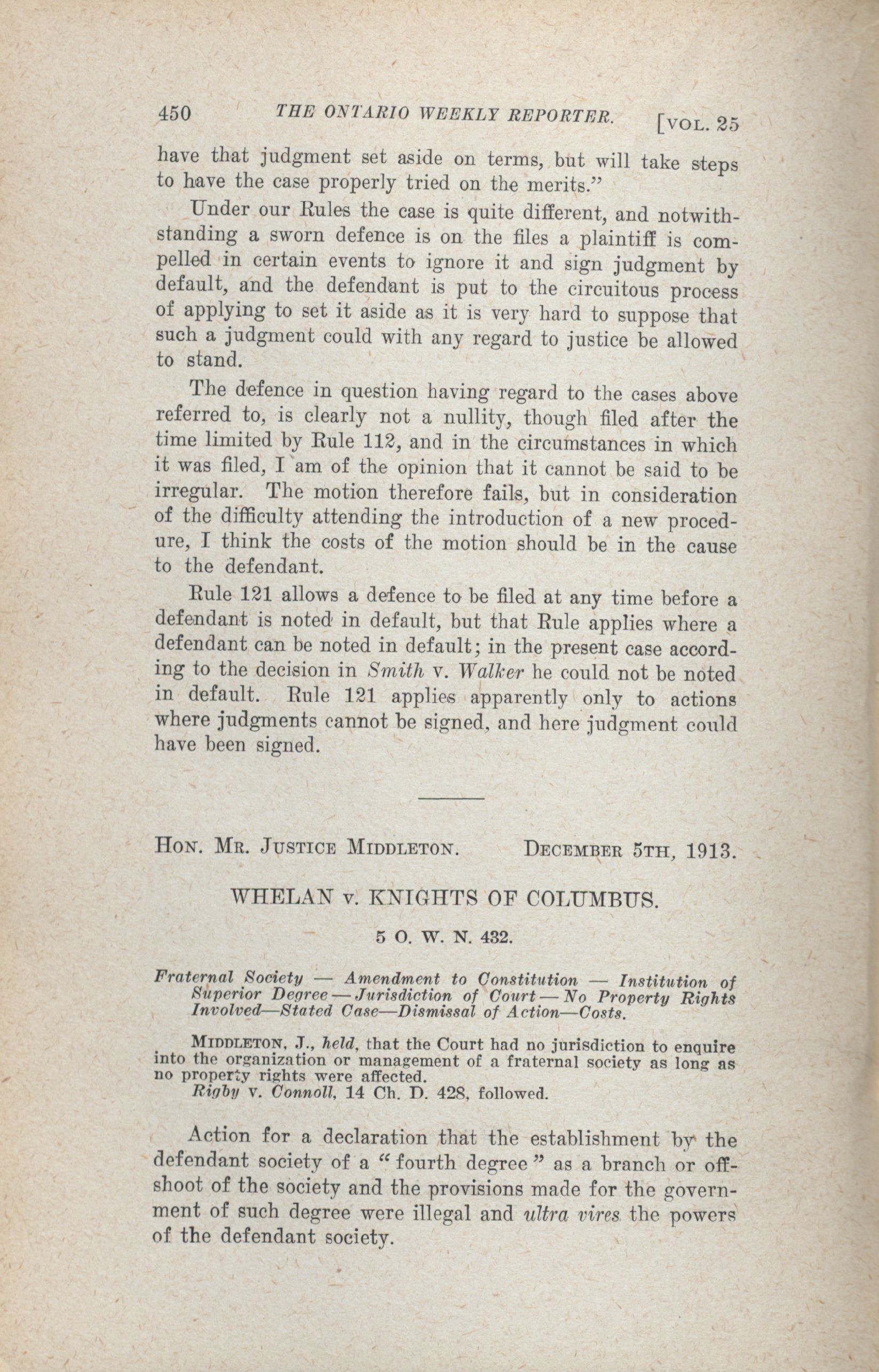 The Ontario weekly reporter. : Vol. 25 No. 8 (January 8, 1914.)